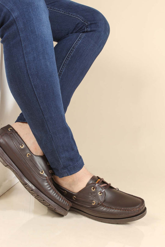 Erkek Kahverengi Deri Bağcıklı Yat Ayakkabısı - Wessi