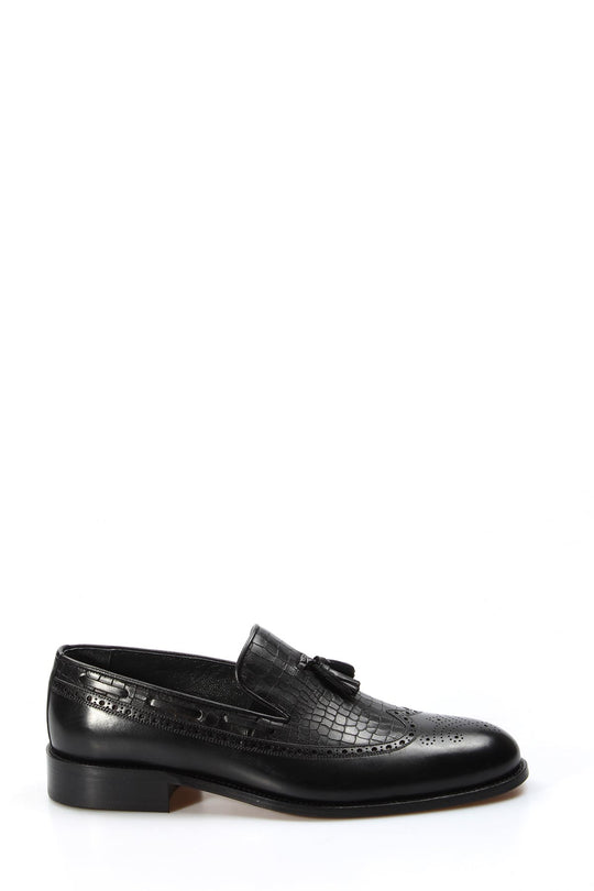 Erkek Siyah Timsah Desenli Deri Püsküllü ve Delikli Desenli Loafer - Wessi
