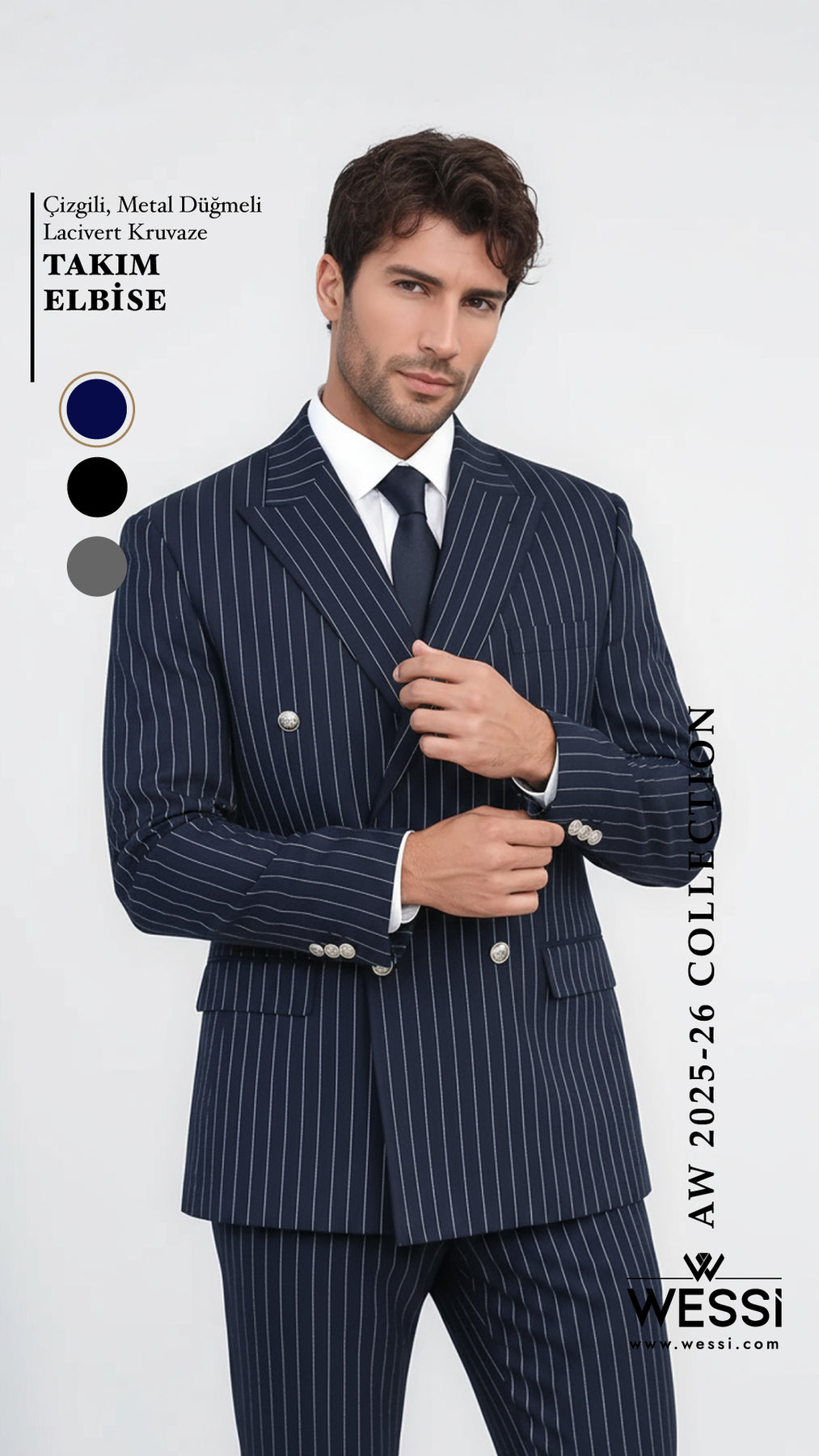 Şıklığınızı bir üst seviyeye taşıyın! Çizgili Kruvaze Düğme Detaylı Lacivert Erkek Takım Elbise - Wessi, klasik pinstripe (çizgili) tasarımı ve modern kesimi ile zarafeti bir araya getiriyor. İş toplantılarından özel davetlere, düğünlerden resmi etkinliklere kadar her ortamda öne çıkmanızı sağlayacak bu takım elbise, tarzınıza sofistike bir dokunuş katacak.