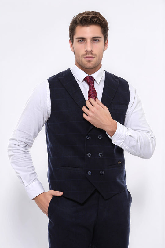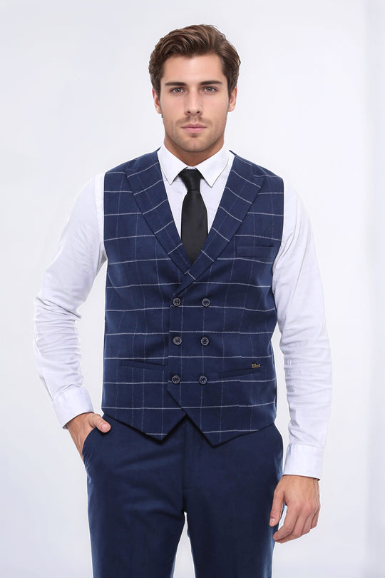 Kruvaze Yakalı Kareli Desenli Lacivert Erkek Yelek - Wessi