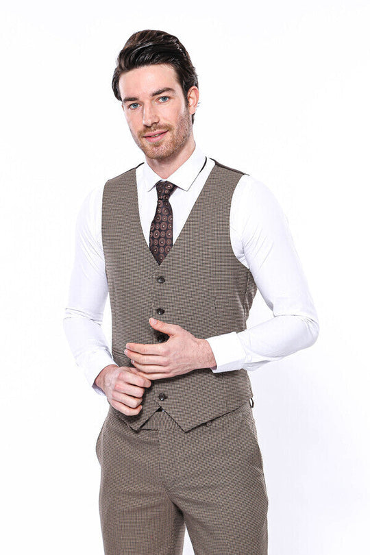 Kahverengi Ekose Desen Hakim Yaka Kaşe Yelek - Wessi