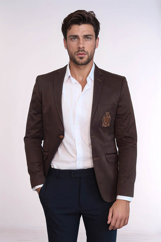 2 Düğmeli 3 Cepli Armalı Pamuk Erkek Kahverengi Ceket - Wessi