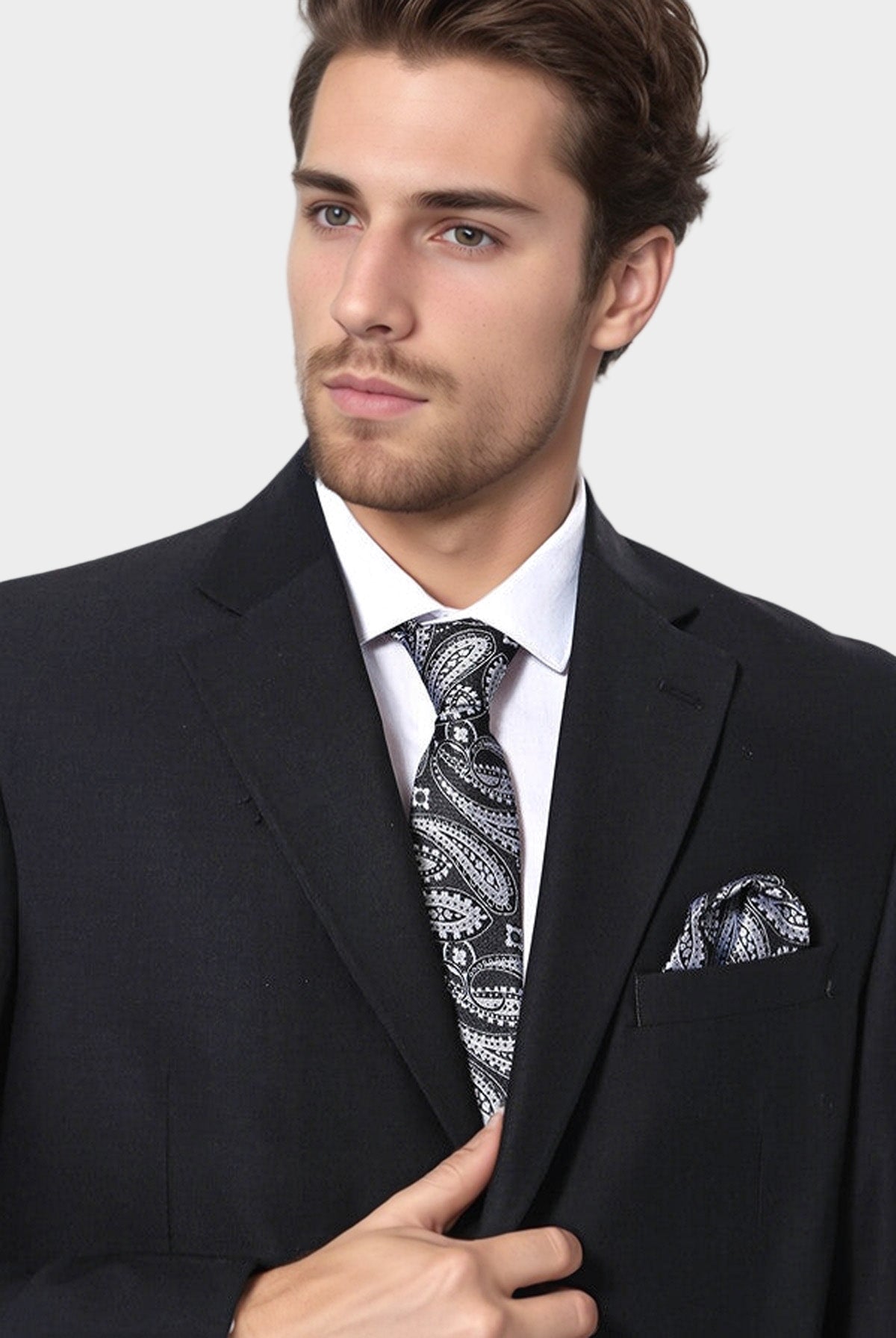 ✔️ Beyaz gömlek ve desenli veya düz siyah kravatla tamamlandığında şık ve klasik bir stil elde edilir.