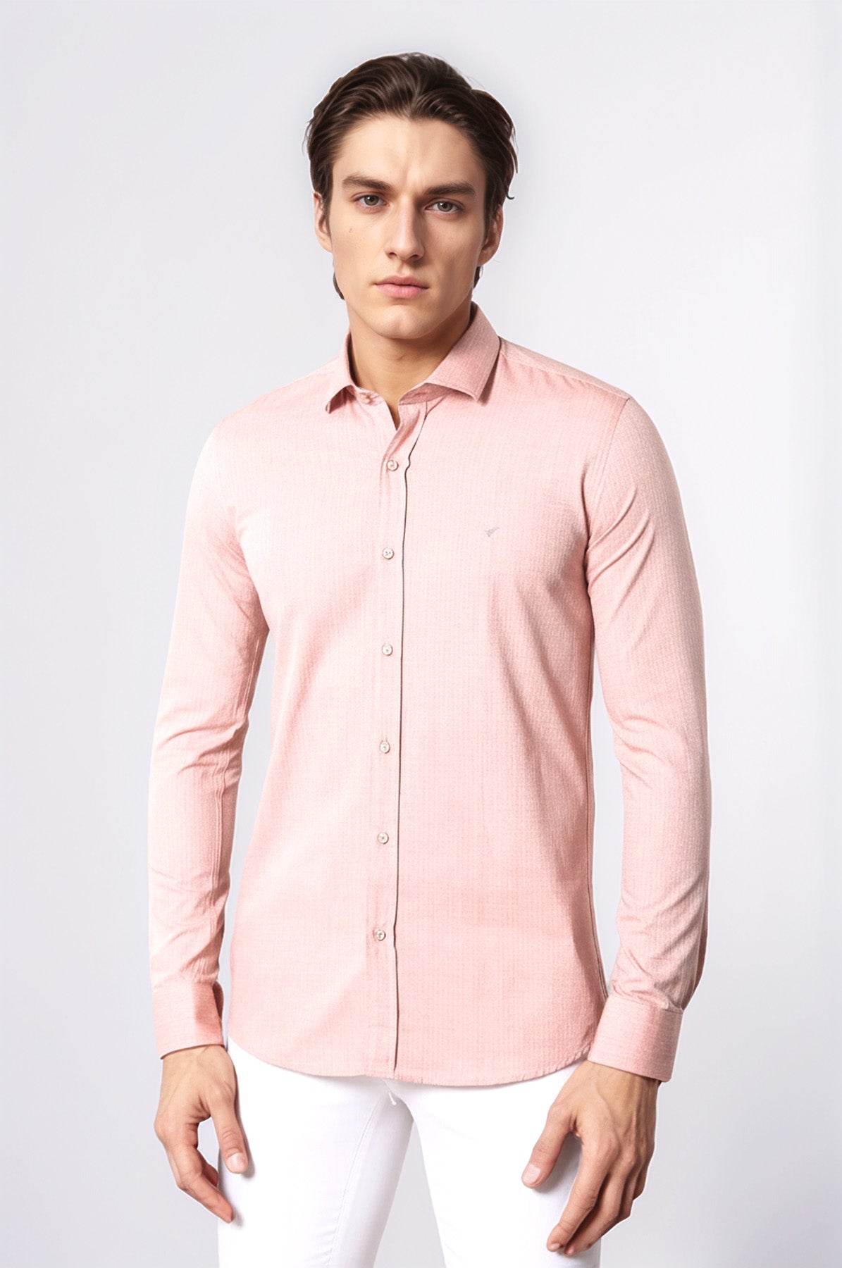 Pamuk kumaş ile üretilmiş, cepsiz modelli ve slim fit detaylı açık bordo renk erkek gömlek modelidir.