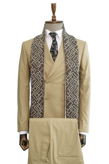 Zamansız klasik stilin modern detaylarla buluştuğu bu Wessi kombini, şıklığı ve prestiji ön planda tutan erkekler için özel olarak hazırlandı. Bej kruvaze takım elbise, sofistike bir duruş sunarken, beyaz gömlek ve desenli kravat ile tamamlanarak kusursuz bir görünüm oluşturuyor. Kahverengi geometrik desenli şal ise kombine zarif ve özgün bir hava katarak stilinizi bir adım öne çıkarıyor.