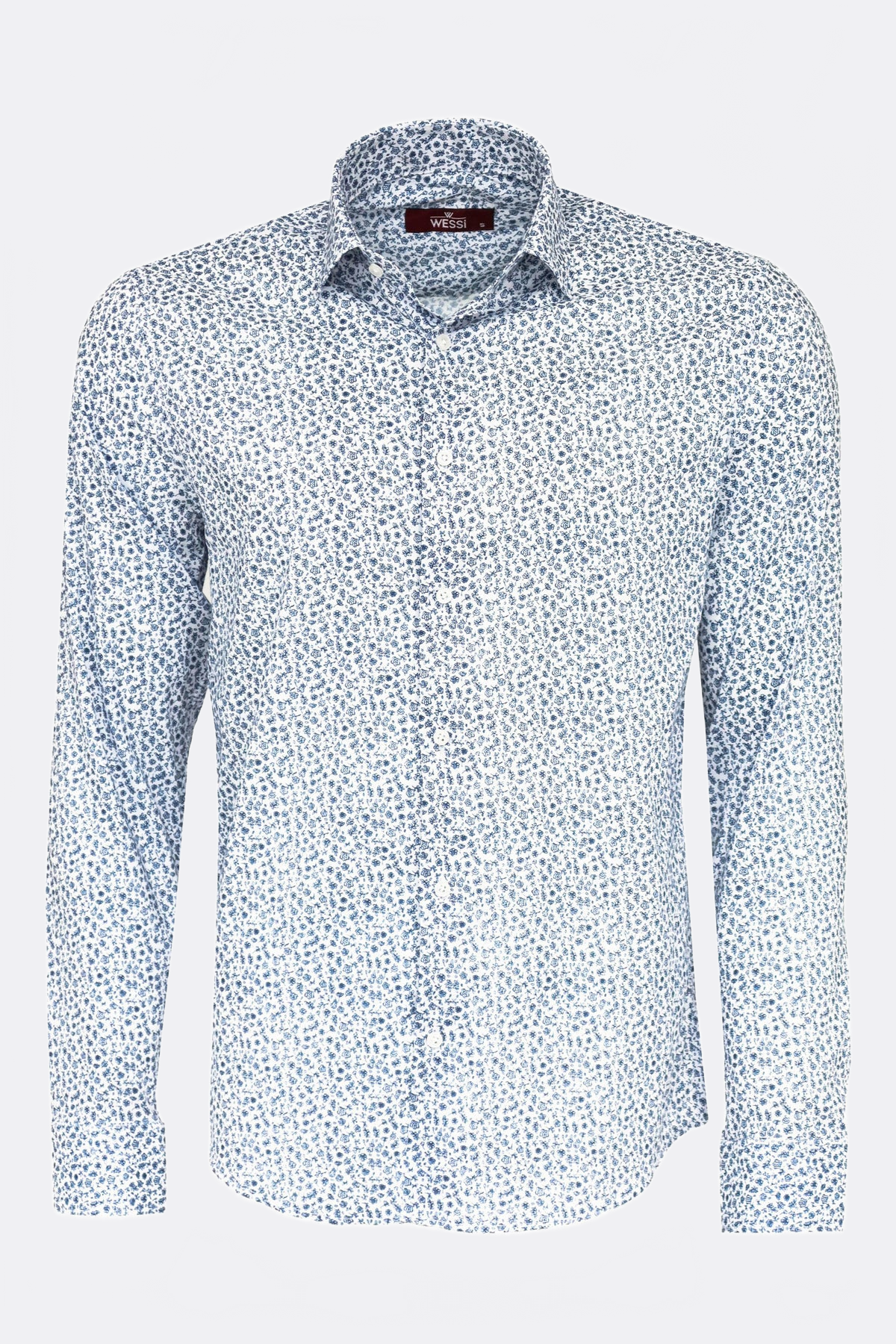 Beyaz Üzerine Mavi Çiçek Desenli Slim Fit Gömlek - Wessi