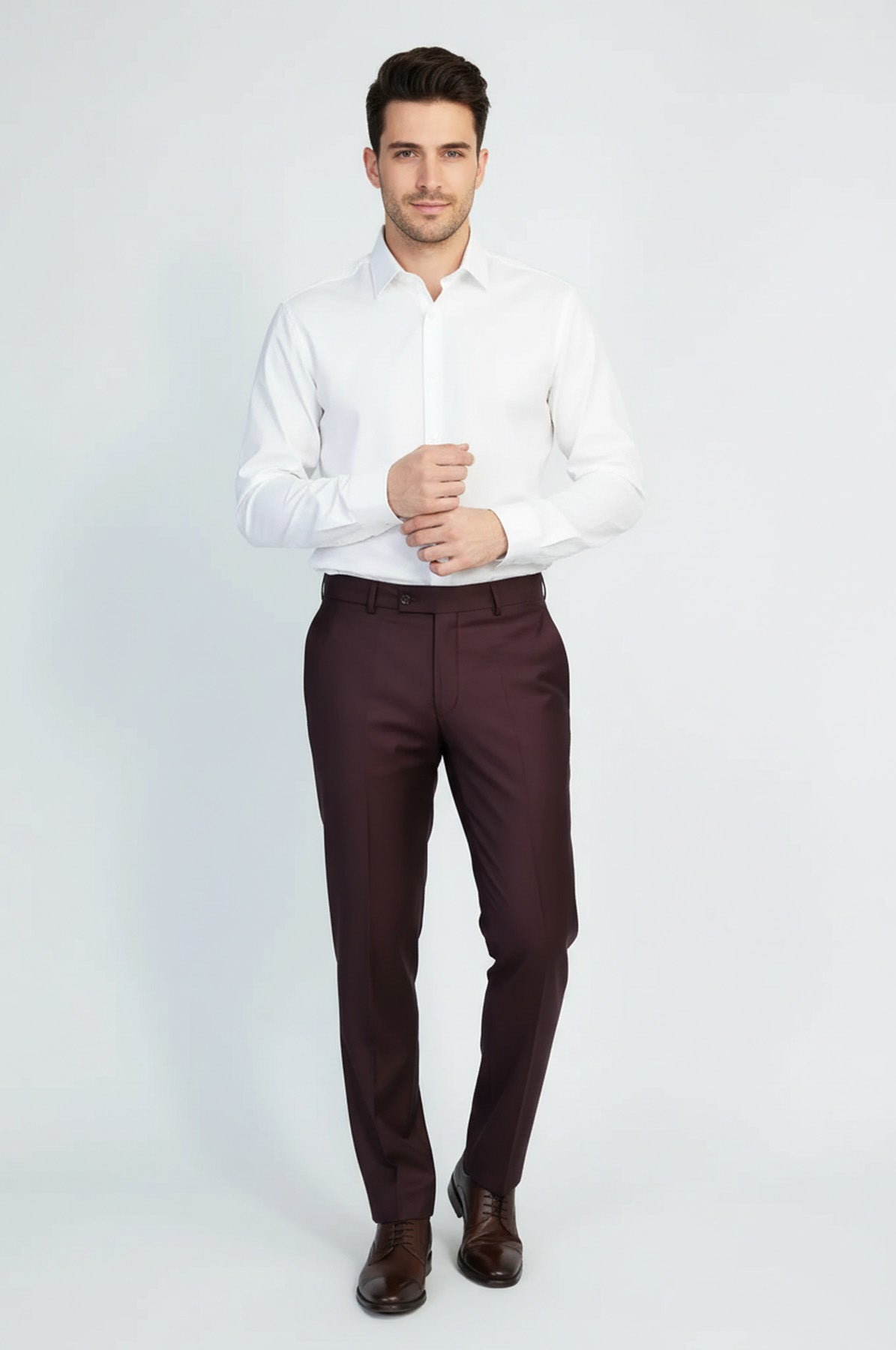 Bordo düz kumaş pantolon ile iş toplantılarından günlük şık kombinlere kadar her ortamda rahat ve modern görünün. Düz desen ve slim fit kesimiyle sofistike bir pantolon.