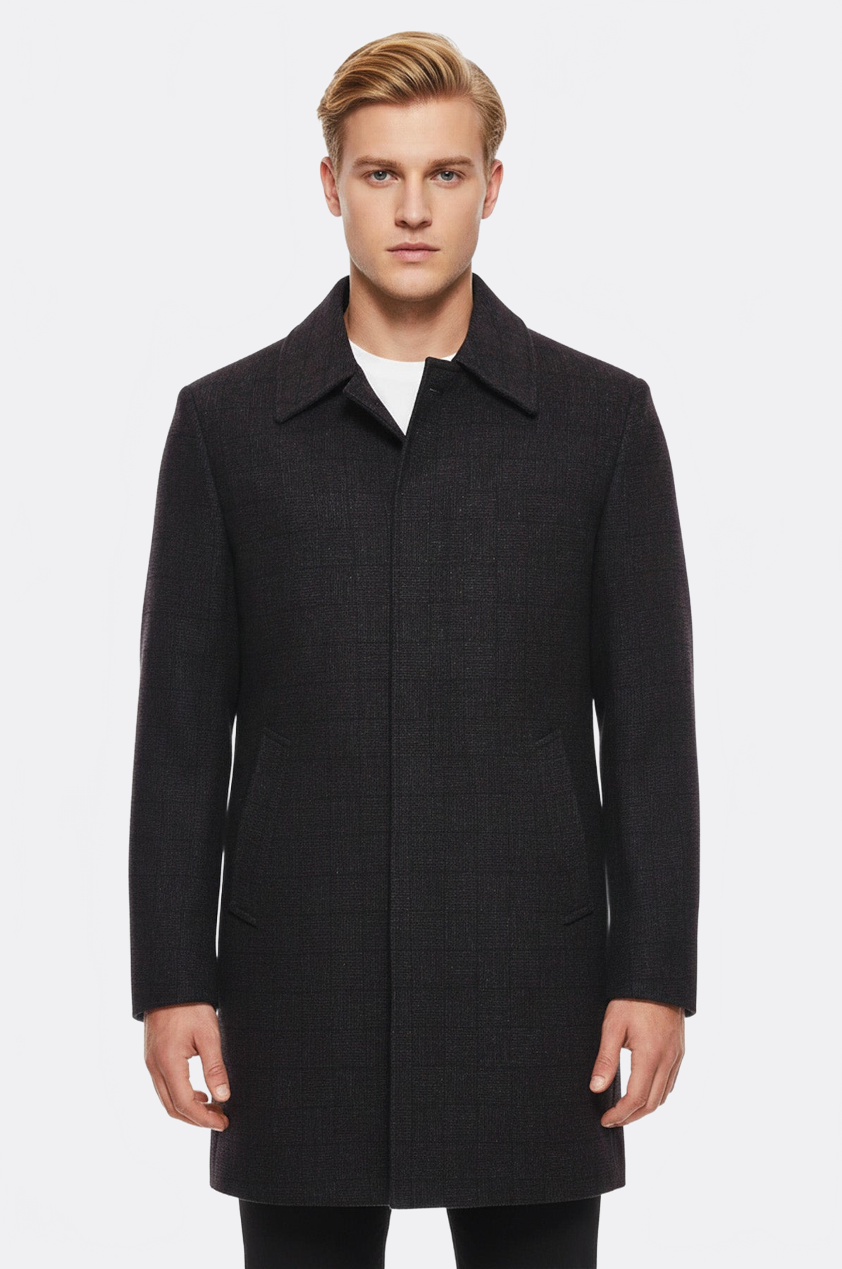 Bordo Ekose Desenli Gizli Düğme Sivri Yaka Kaban