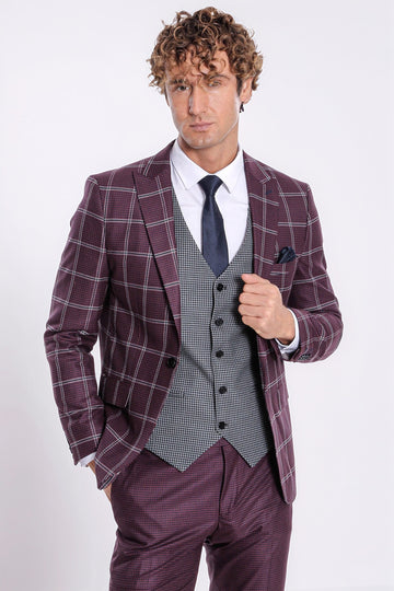 Bordo Ekoseli Desenli Yelekli Takım Elbise - Wessi