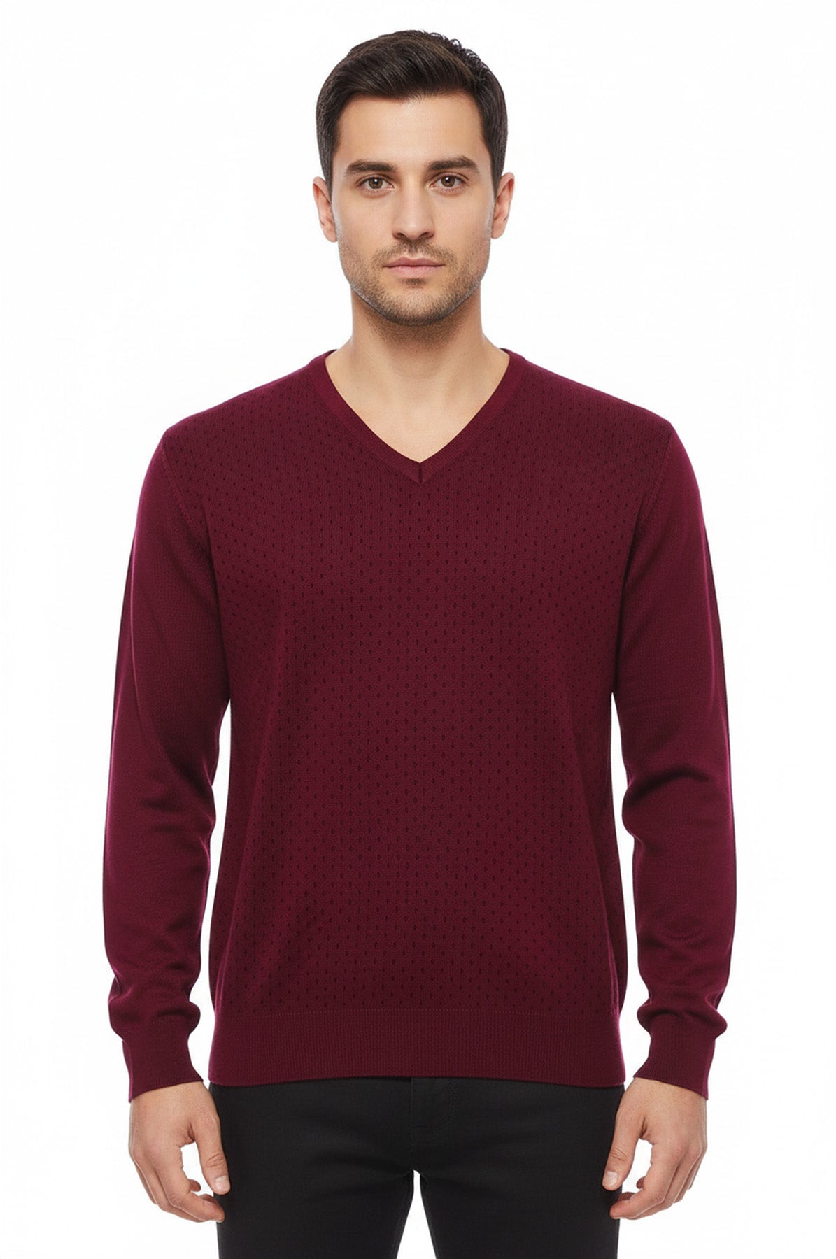 Bordo Nokta Desenli V Yaka Triko - Wessi