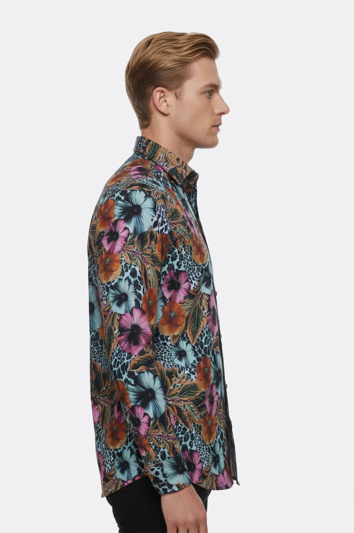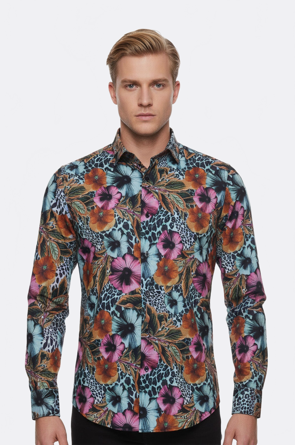 Büyük Çiçek Desenli Slim Fit Uzun Kollu Renkli Erkek Gömlek - Wessi