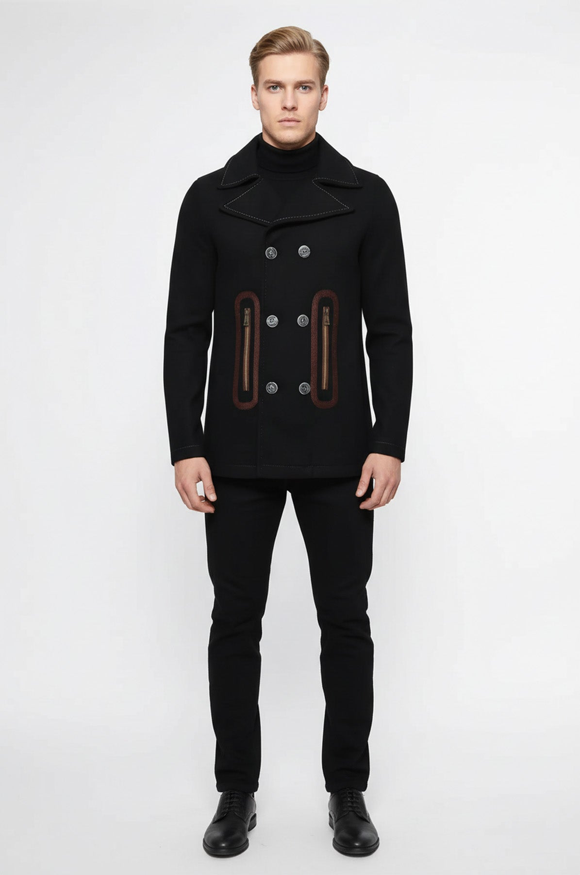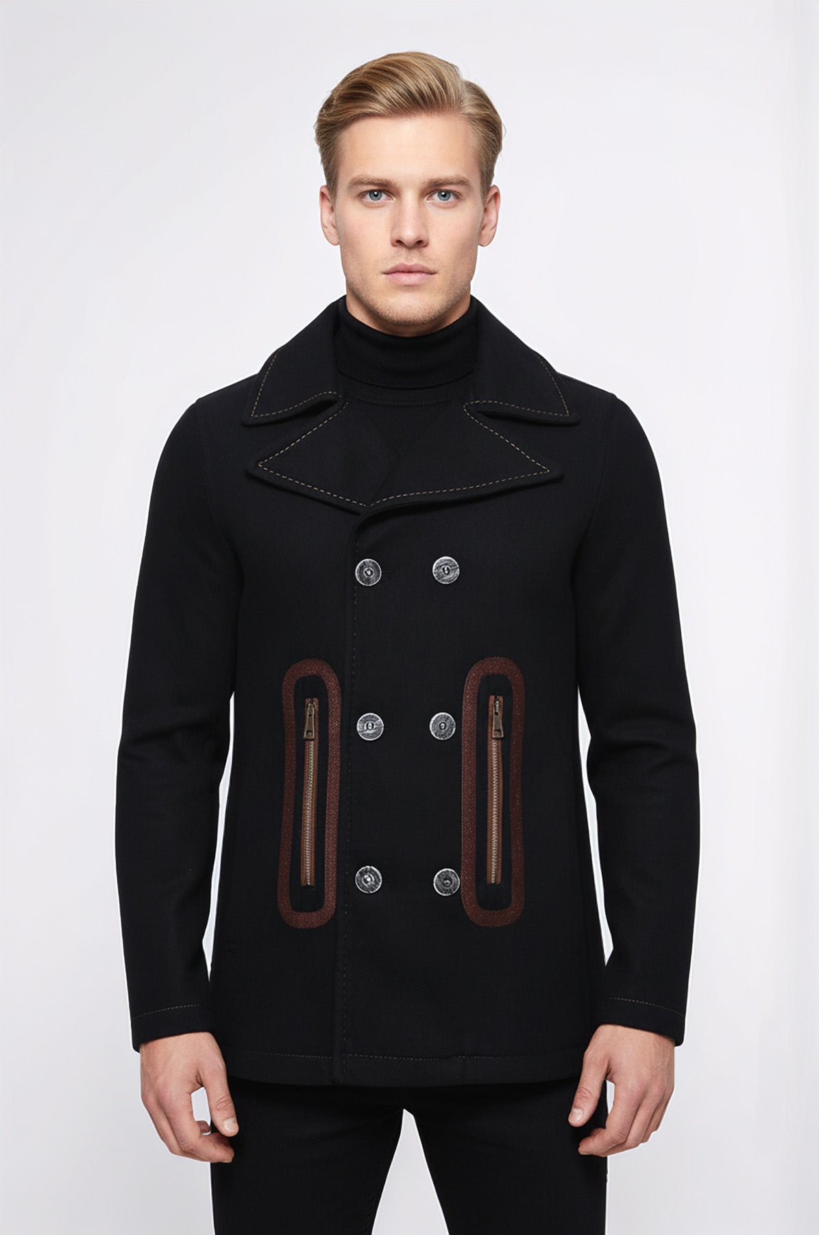 Cep Kenarı İşlemeli 6 Düğmeli Koyu Kahverengi Kaban - Wessi