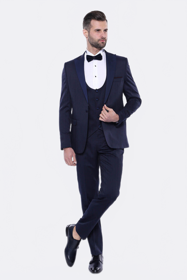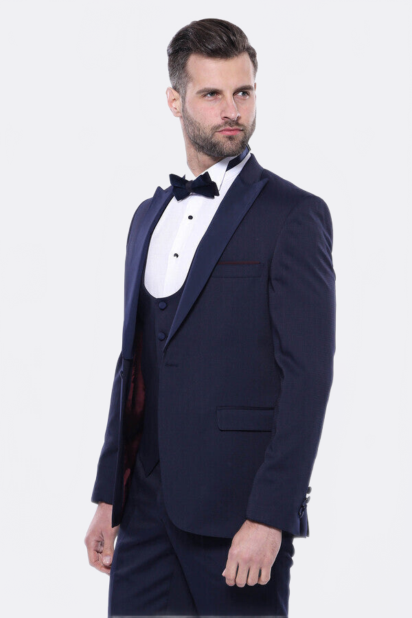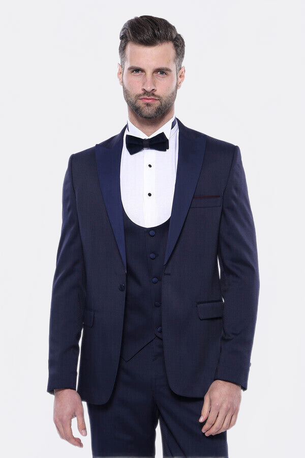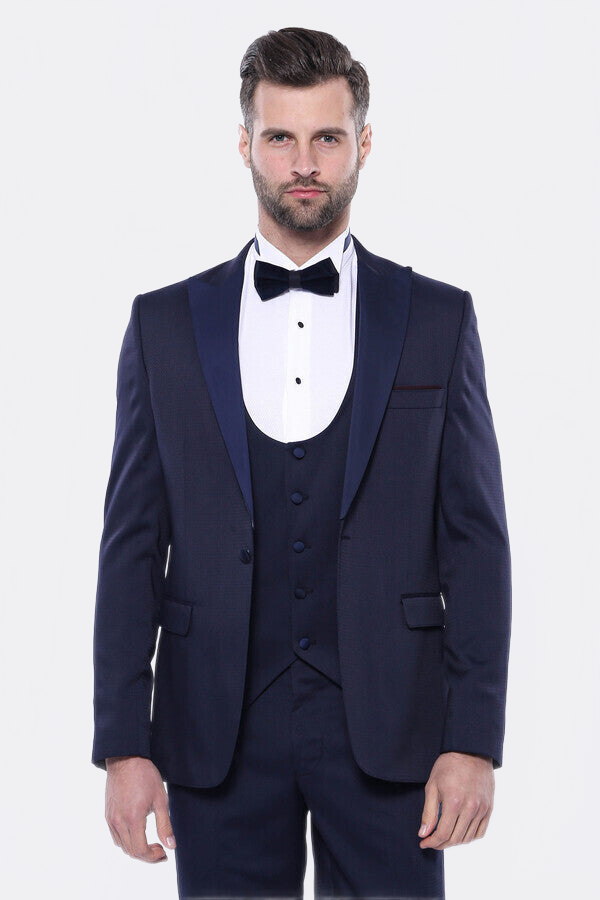 Çıkma Yaka Yelekli Lacivert Damatlık Takım Elbise | Wessi