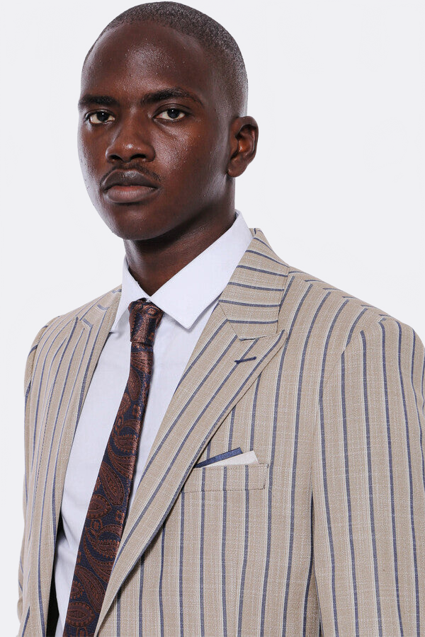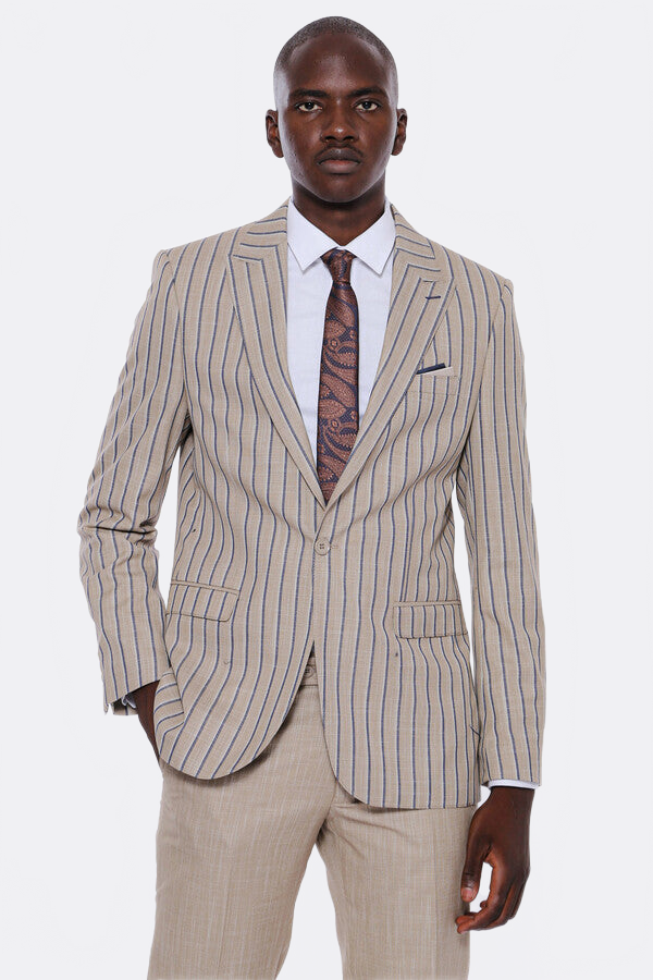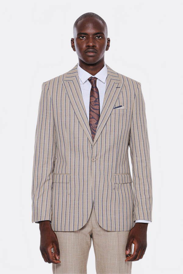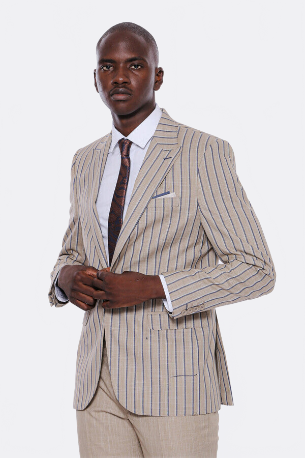 Çizgili Ceket Pantolon Düz Bej Erkek Takım Elbise - Wessi