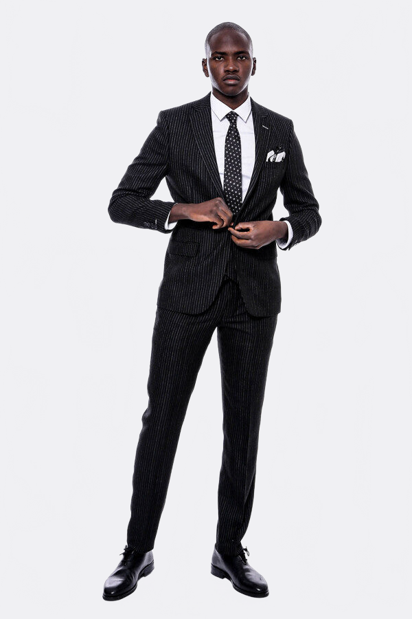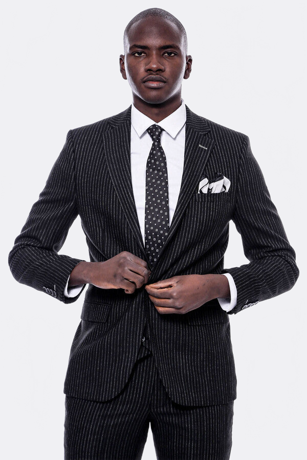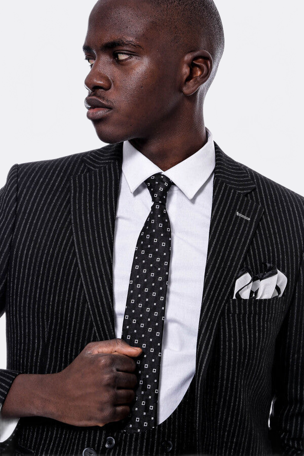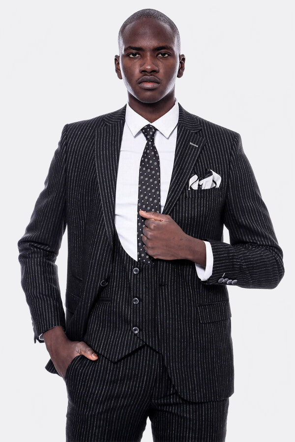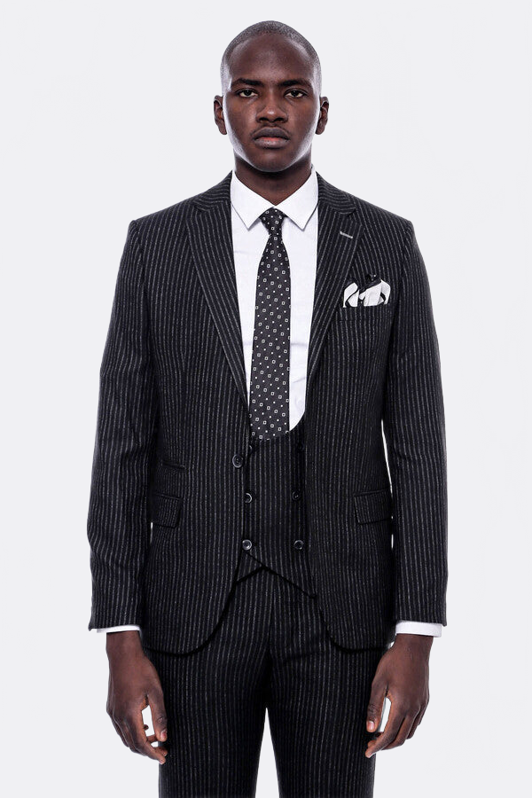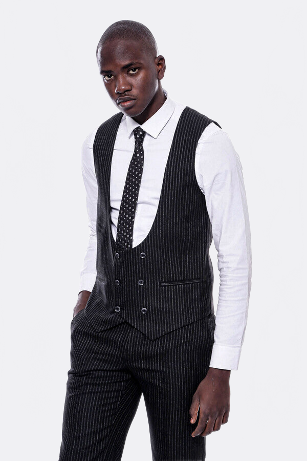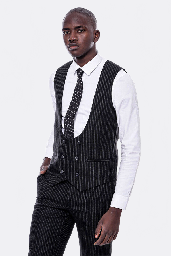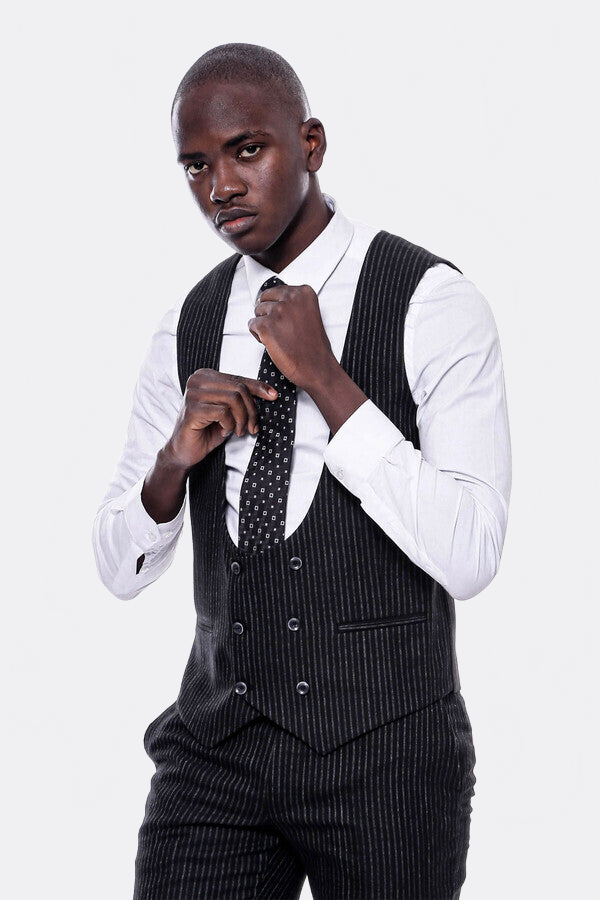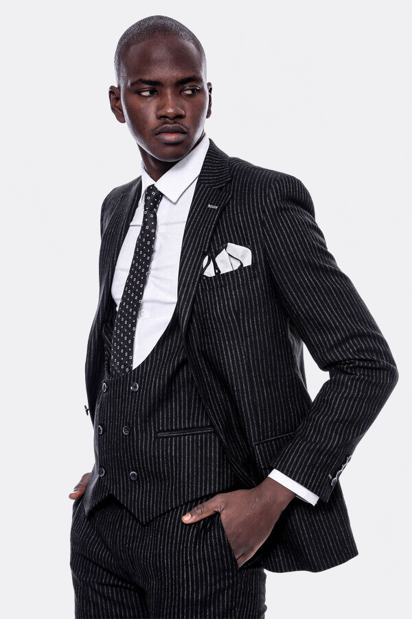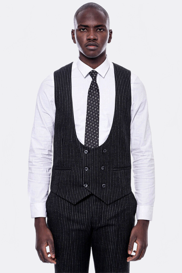 Çizgili Kruvaze Yelekli Siyah Slim Fit Takım Elbise - Wessi