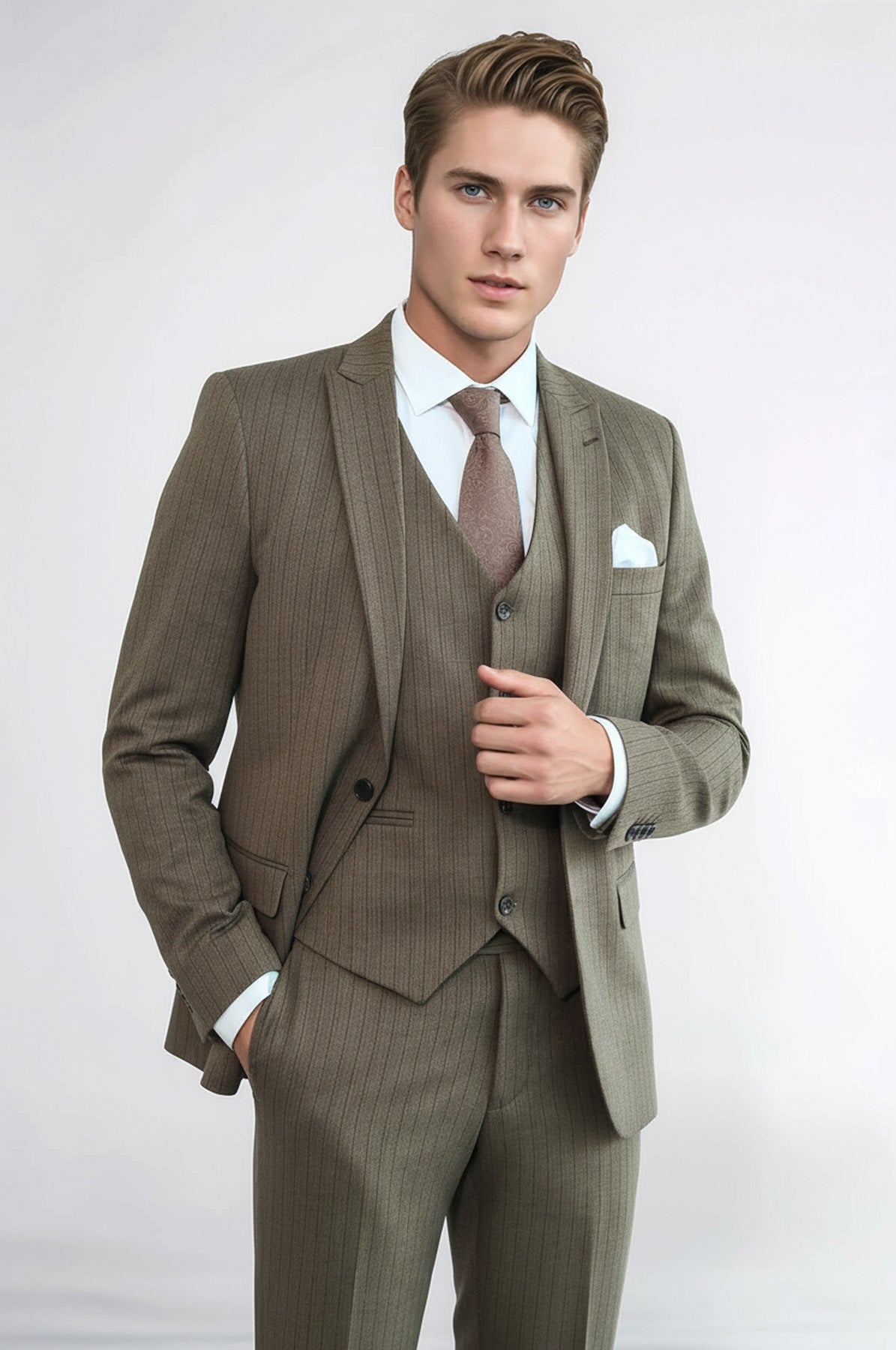 ❓ Bu kahverengi çizgili takım elbise nasıl bir stil sunar?