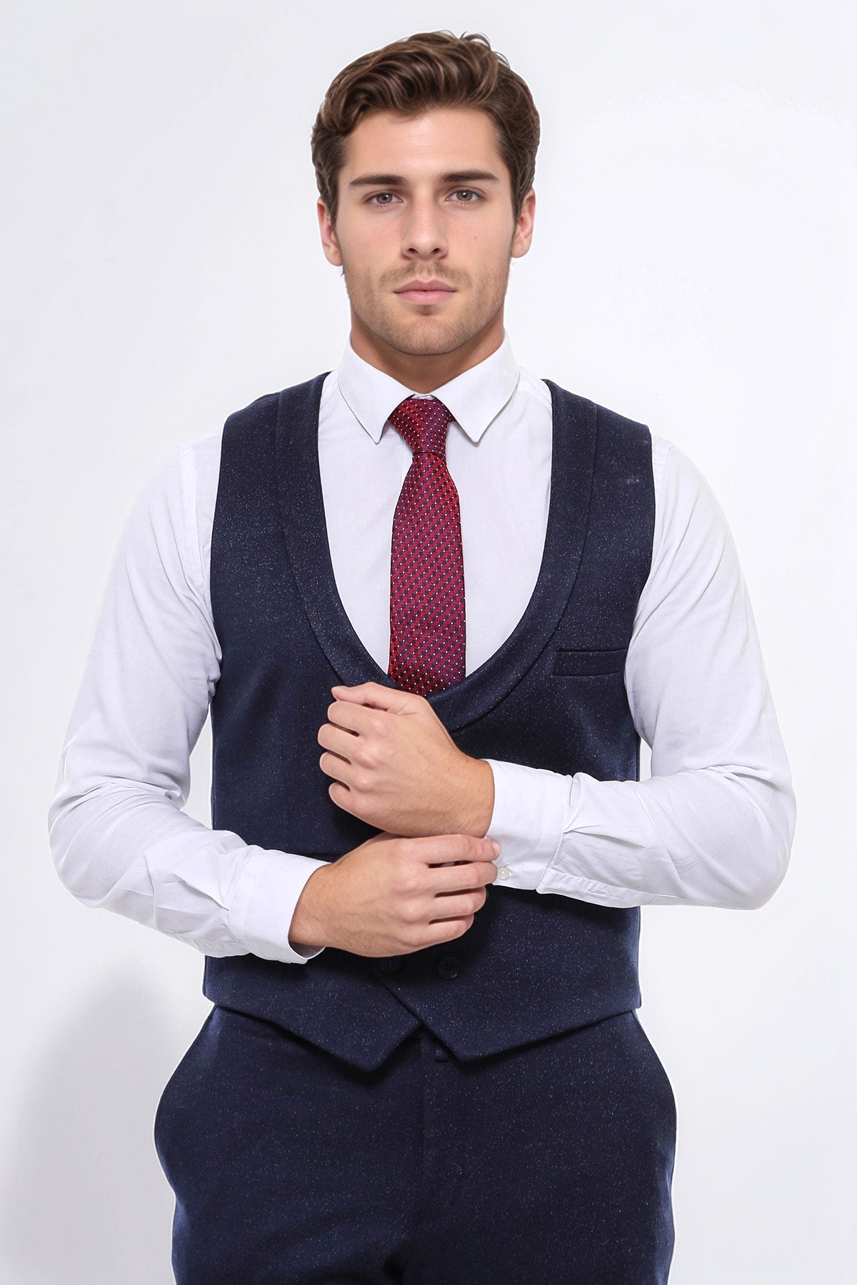 Kendinden desenli kumaşla elde edilmiş slimfit kesim şal yaka detaylı koyu lacivert kruvaze erkek yelek pantolon 2 parça set  modelidir.