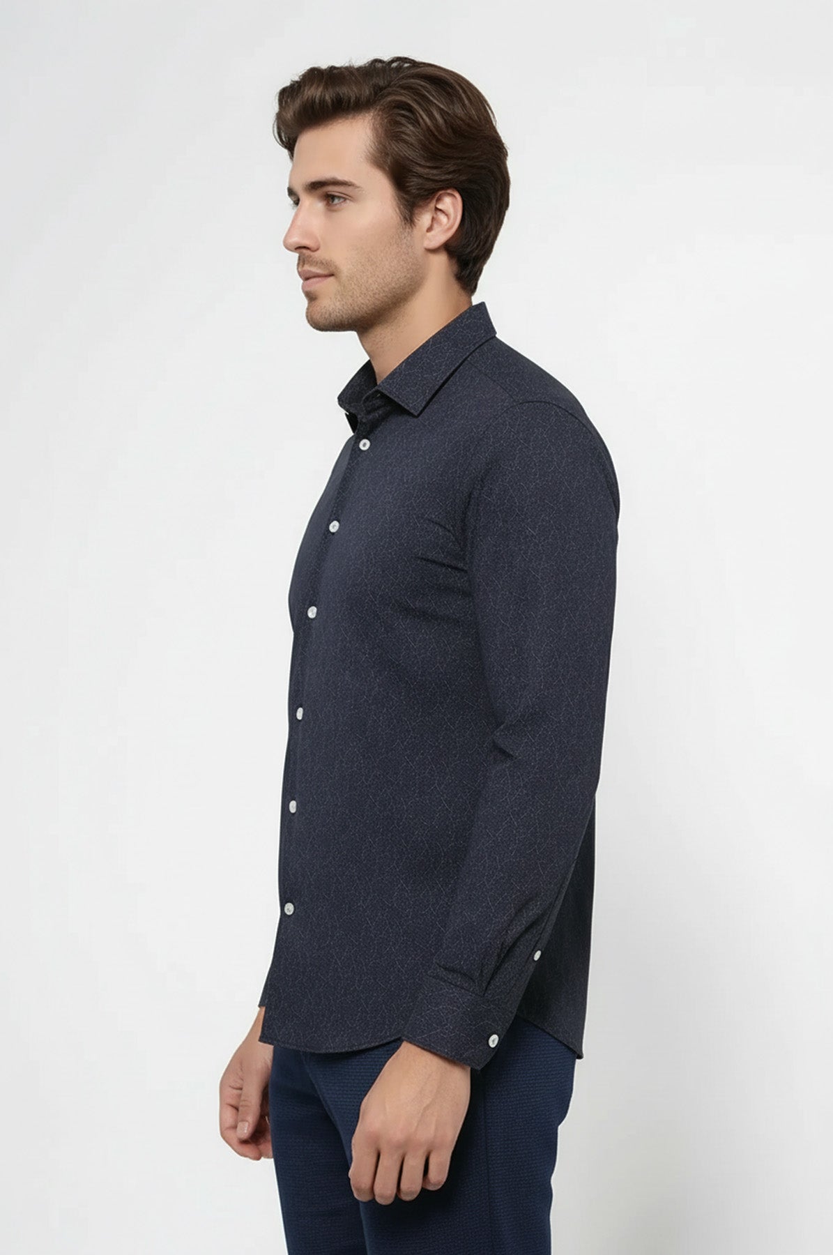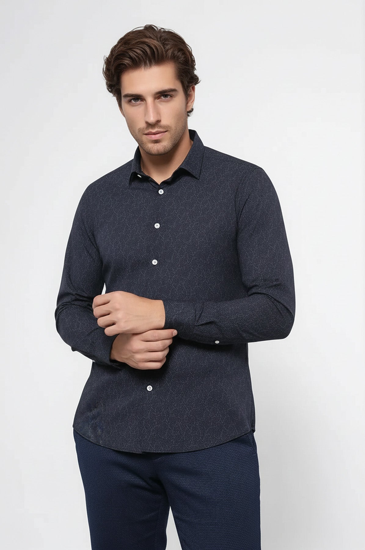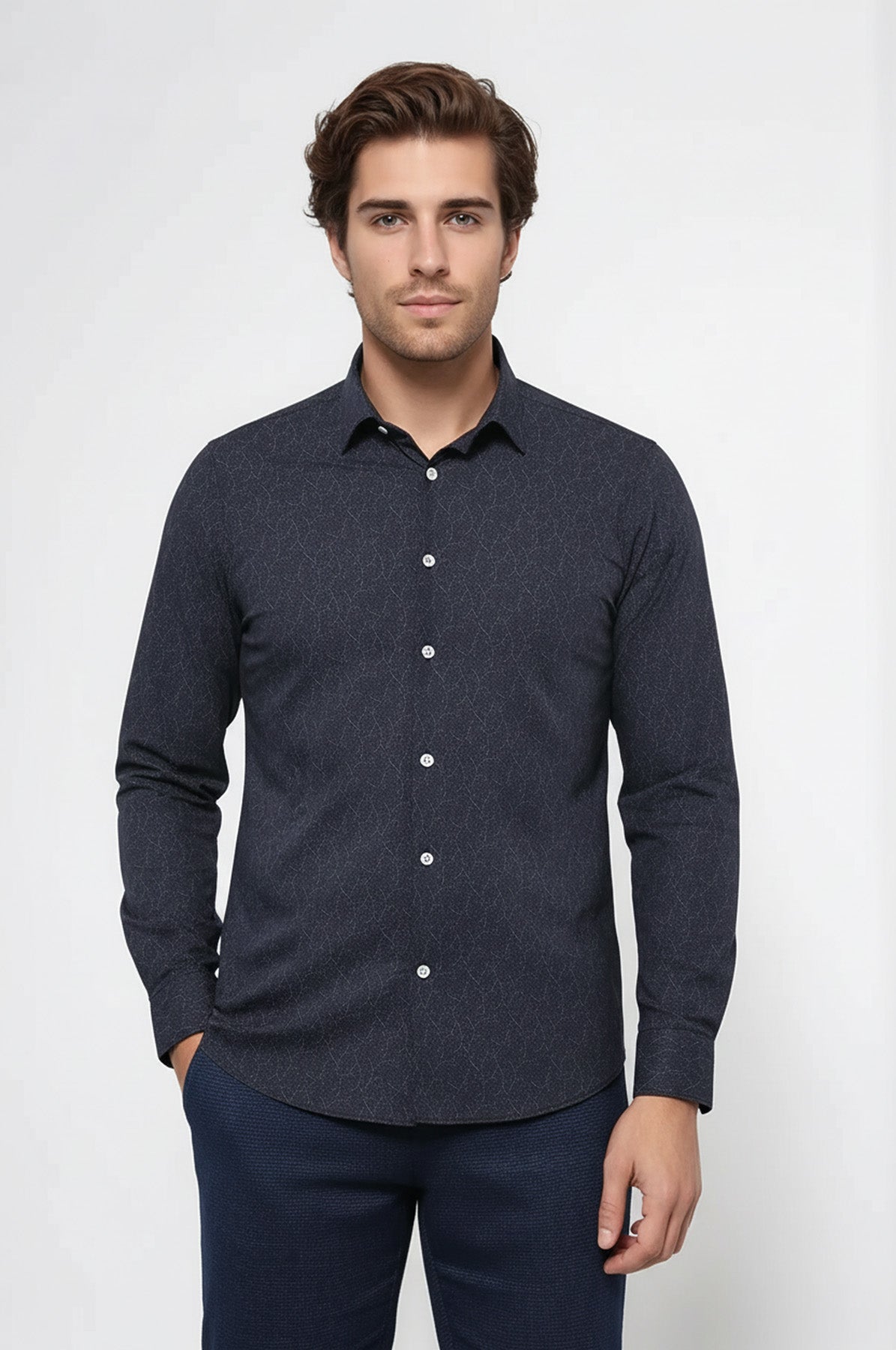 Çiçek desenli pamuk kumaş ile tasarlanmış, dar kesim, uzun kollu, cepsiz düğmesiz yaka detaylı siyah renk slim fit erkek gömlek modelidir. Erkek giyimin olmazsa olmaz parçalarından biri gömlektir. Kumaş pantolon ve kot pantolonla kolaylıkla kombinlenmesi açısından gömlek her zaman tercih edilir. Her erkeğin dolabında mutlaka siyah renk gömlek bulunmaktadır. Siyah, gri, krem, kahverengi pantolonlarla tercih edilir. Kendinden desenli olması ile oldukça modern görülmektedir. Slim fit kesimi ile spor bir görüntü oluşturur. Kot ve spor ayakkabı ile de günlük hayatta sıklıkla tercih edilir.