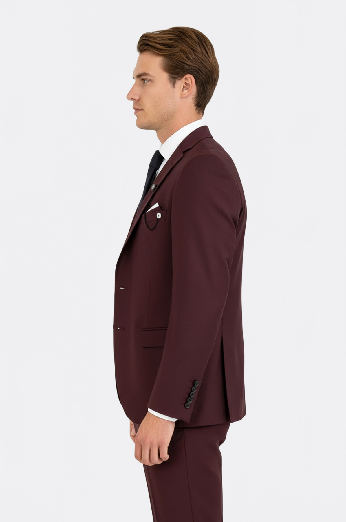 Bordo takım elbise ile iş hayatında zarif ve farklı görünün. Düz kumaş, yelekli tasarım ve slim fit kesimiyle şık bir takım.