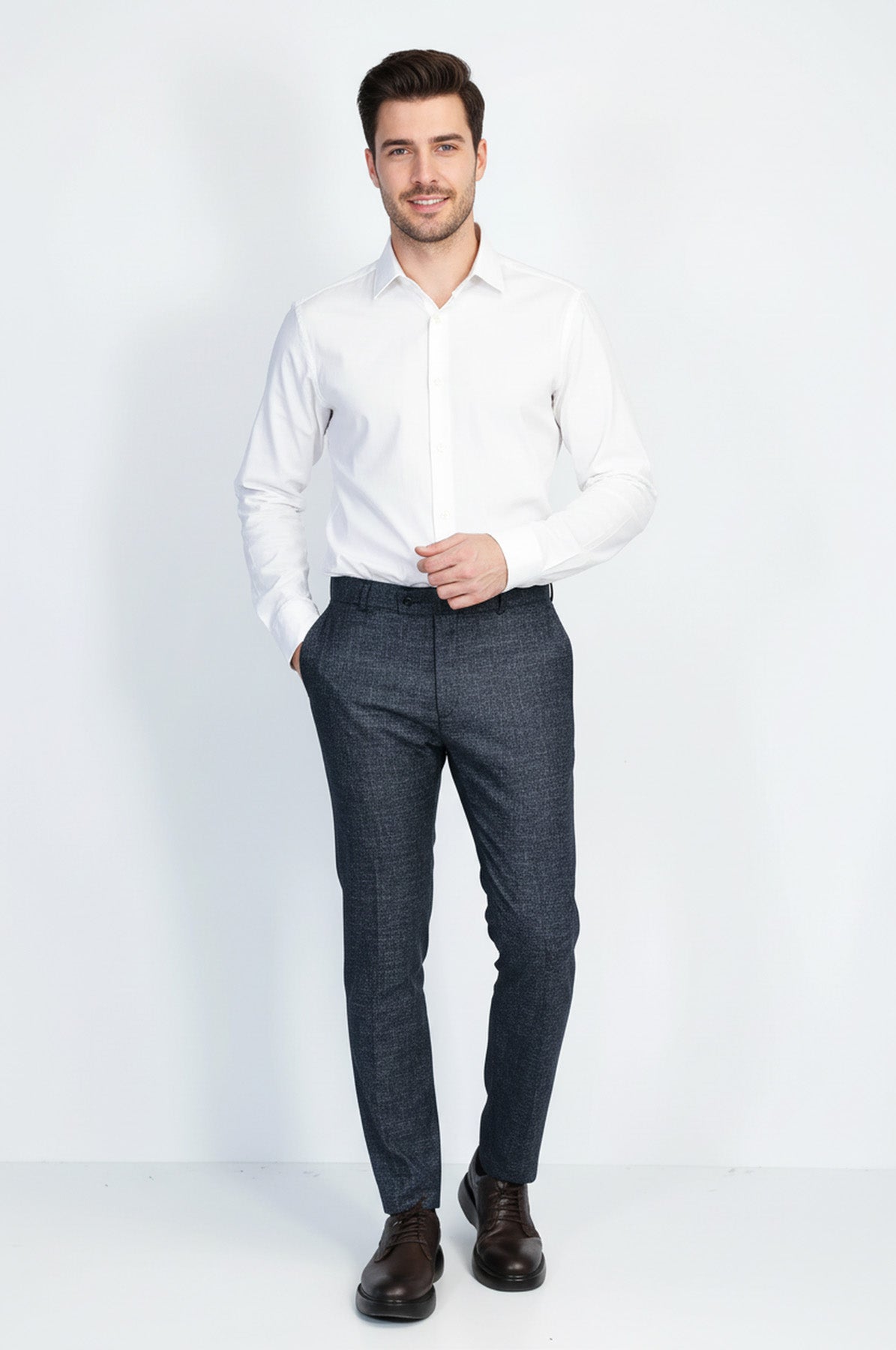 Zarif ve modern tasarımıyla dikkat çeken Düz Koyu Lacivert Erkek Pantolon, klasik ve şık kombinler için mükemmel bir seçenektir. Slim fit kesimi, vücuda oturarak şık ve zarif bir siluet sunarken, koyu lacivert rengi sofistike ve zamansız bir tarz sağlar. Yüksek kaliteli kumaşı sayesinde gün boyu konforlu bir kullanım sunar.