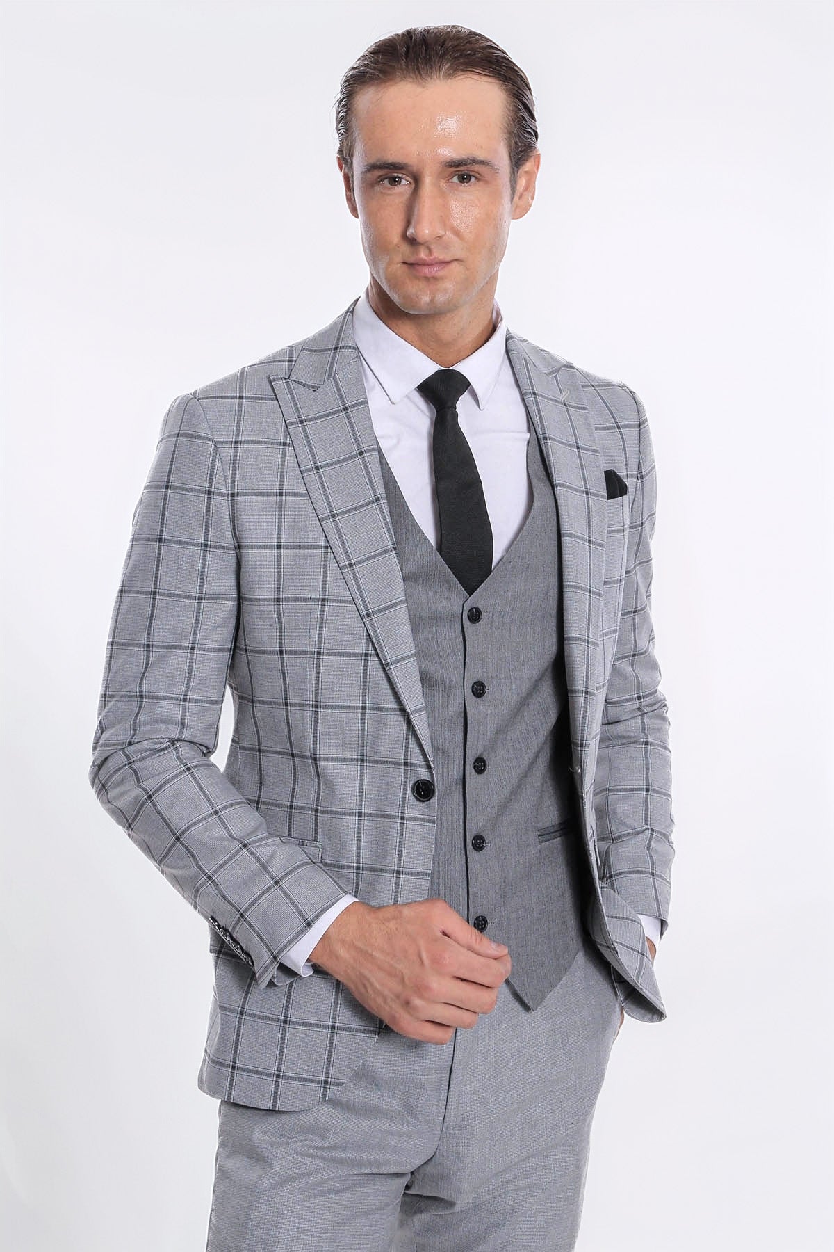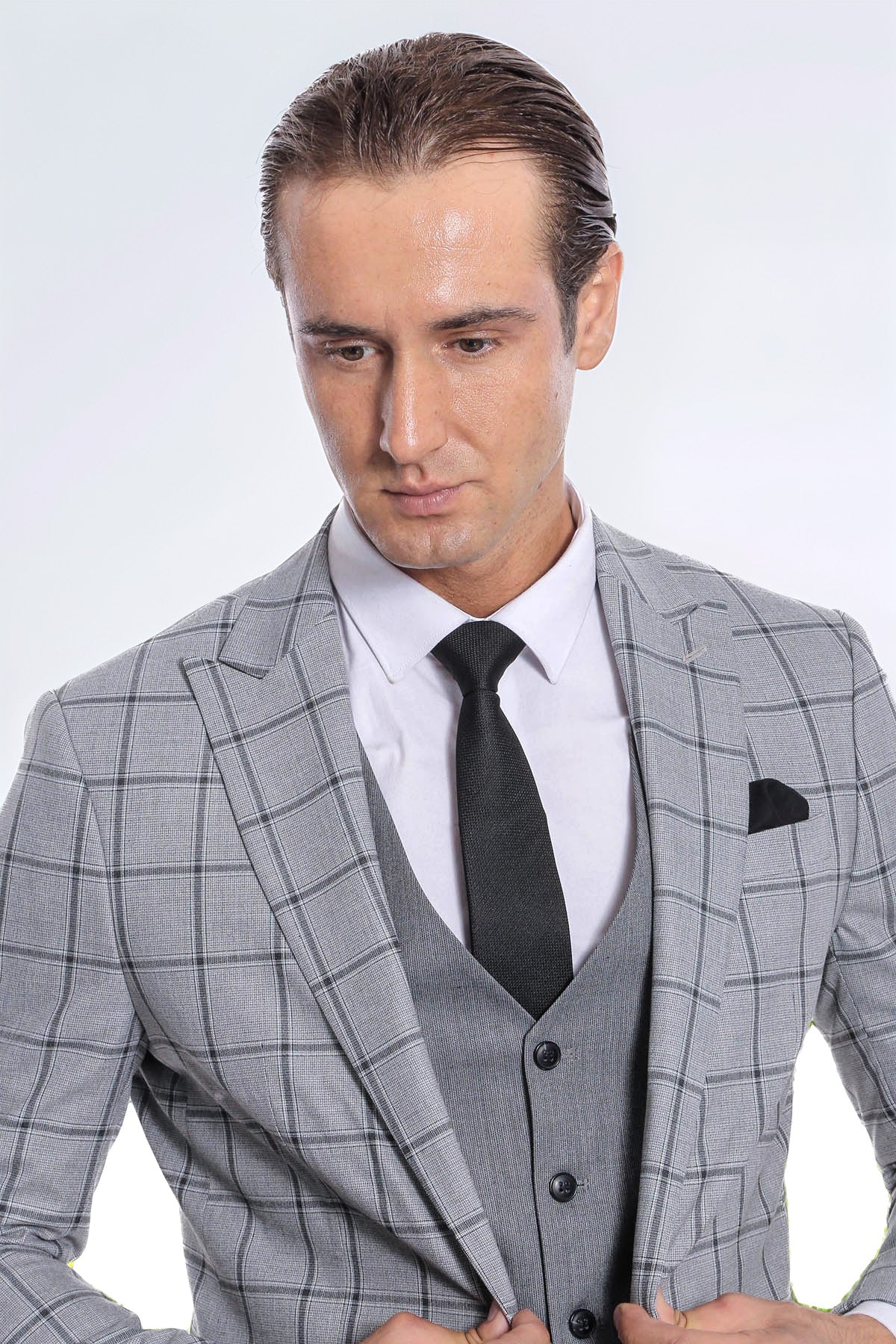 Ekose Ceketli Desenli Slim Fit Gri Erkek Takım Elbise - Wessi