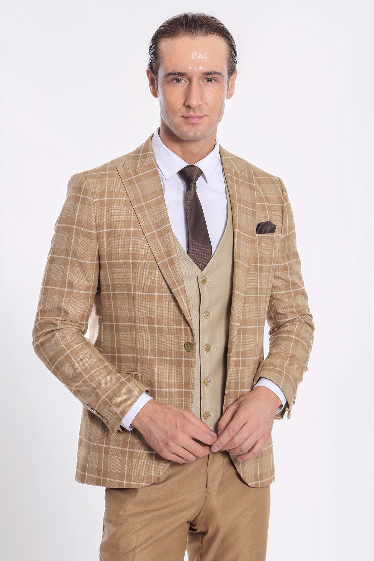 Ekose Ceketli Slim Fit Bej Erkek Takım Elbise - Wessi