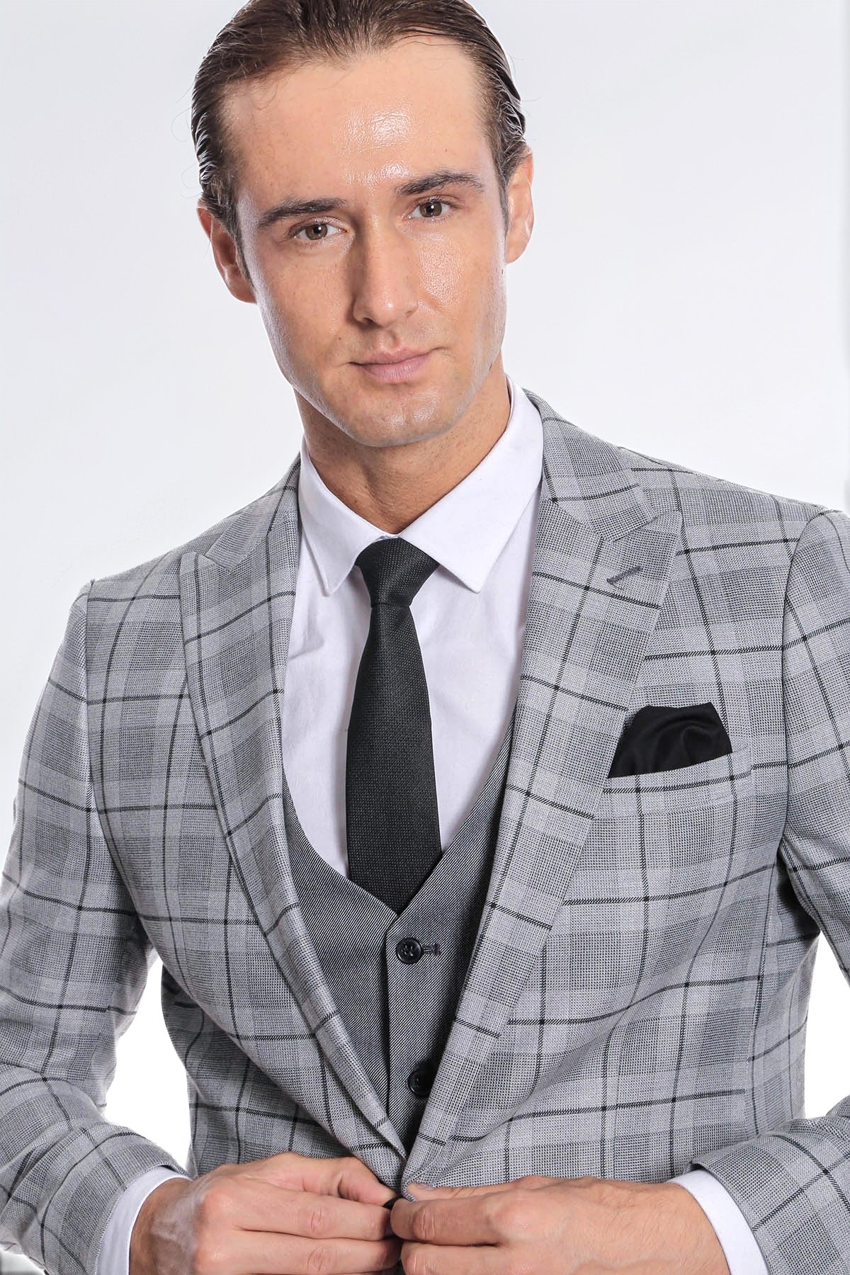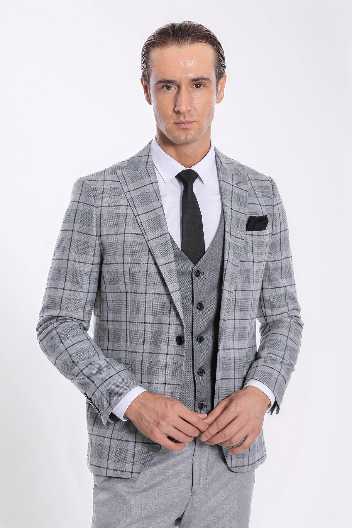 Ekose Ceketli Slim Fit Gri Erkek Takım Elbise - Wessi