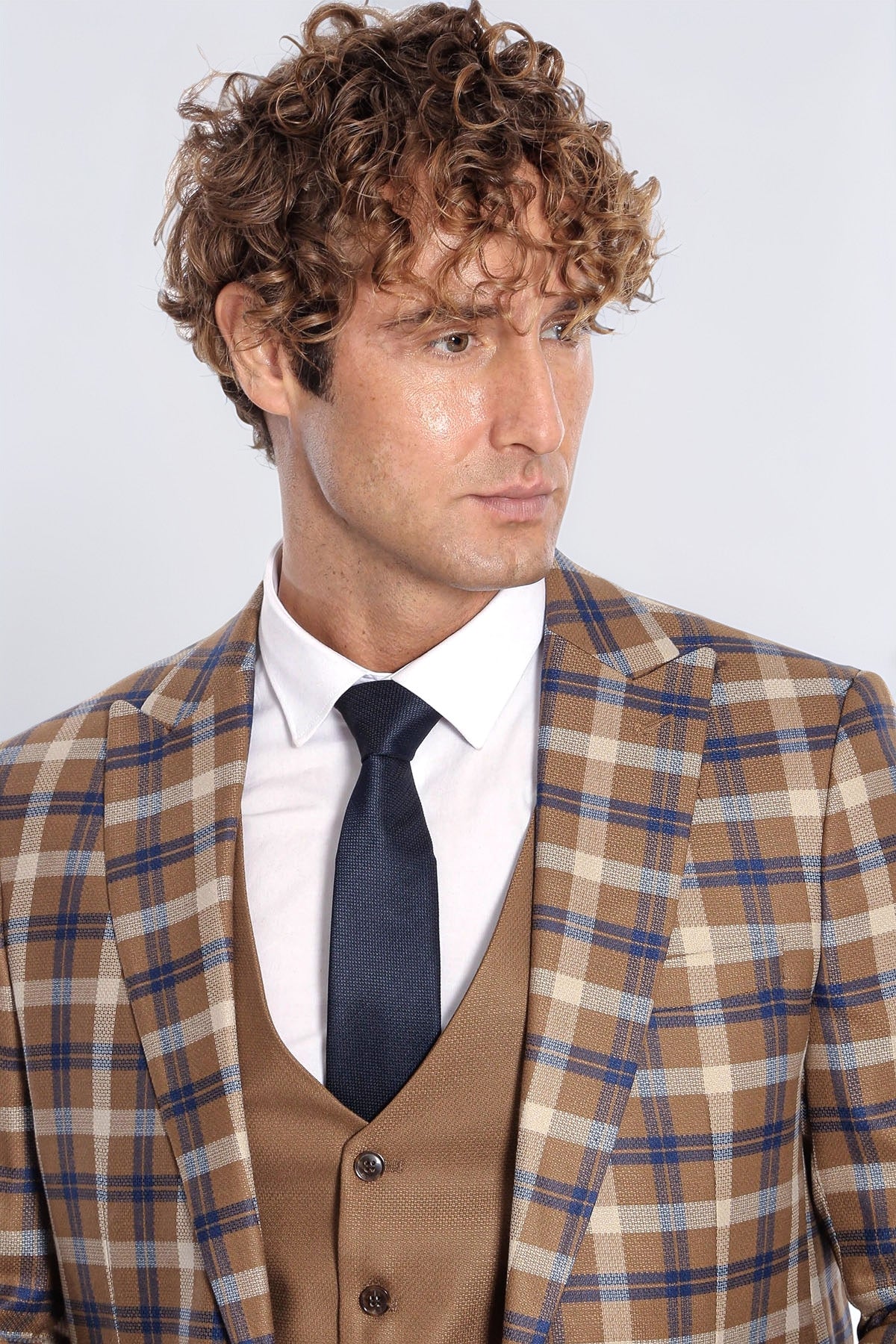 Ekose Ceketli Slim Fit Kahverengi Erkek Takım Elbise - Wessi