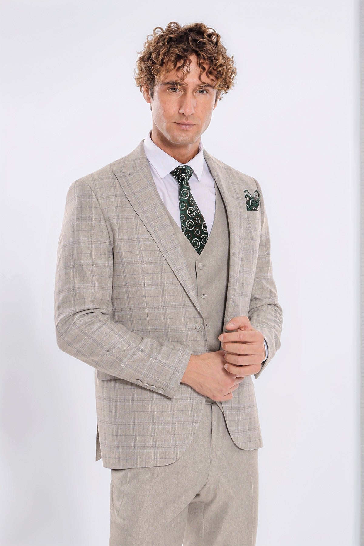 Ekose Ceketli Slim Fit Krem Erkek Takım Elbise - Wessi