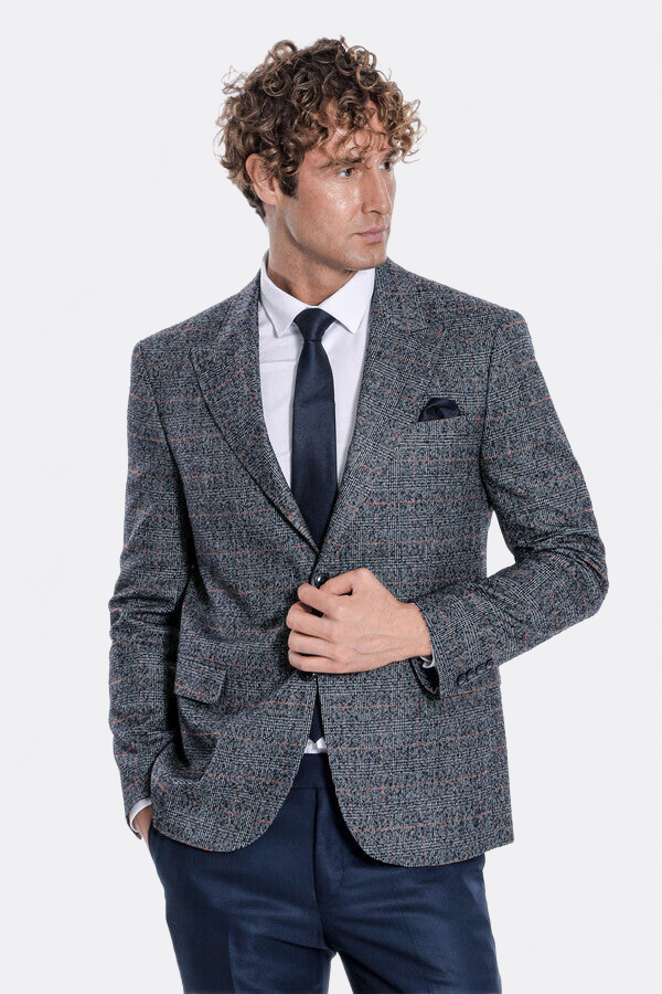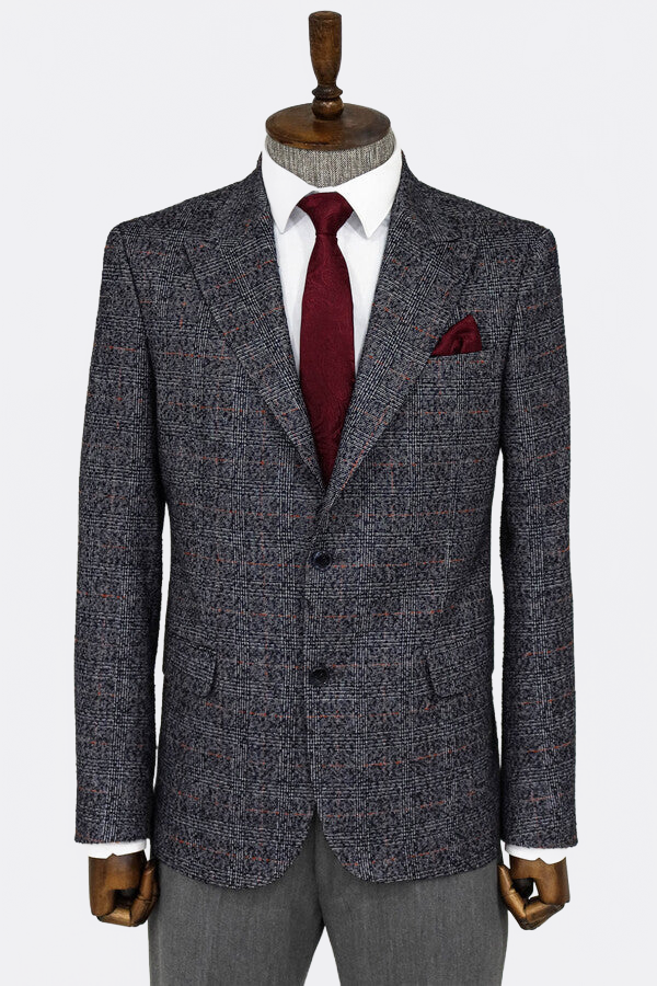 Ekose Desen Slim Fit Lacivert Erkek Ceket - Wessi