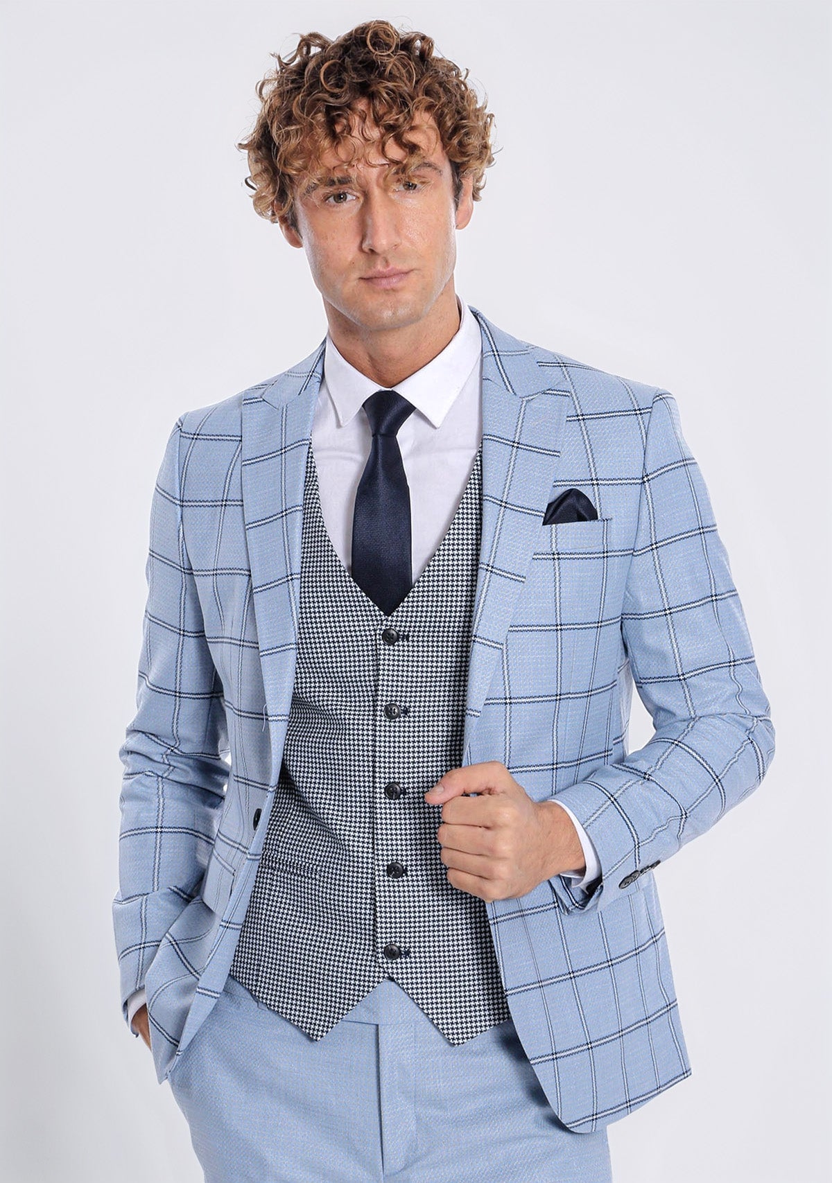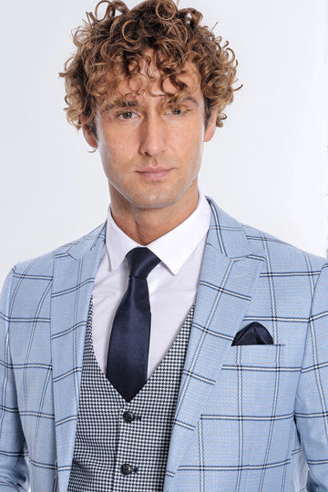 Ekose Desenli Dar Kesim Açık Mavi Erkek Takım - Wessi