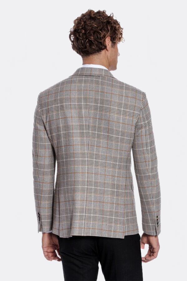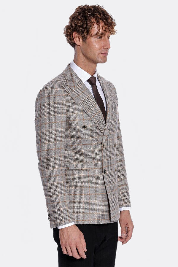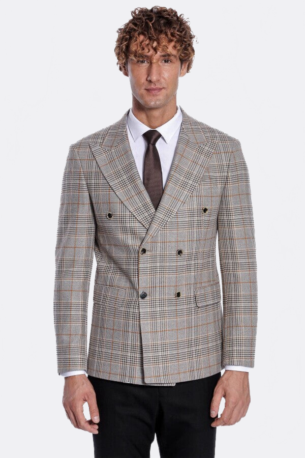 Ekose Desenli Kruvaze Kahverengi Erkek Ceket - Wessi