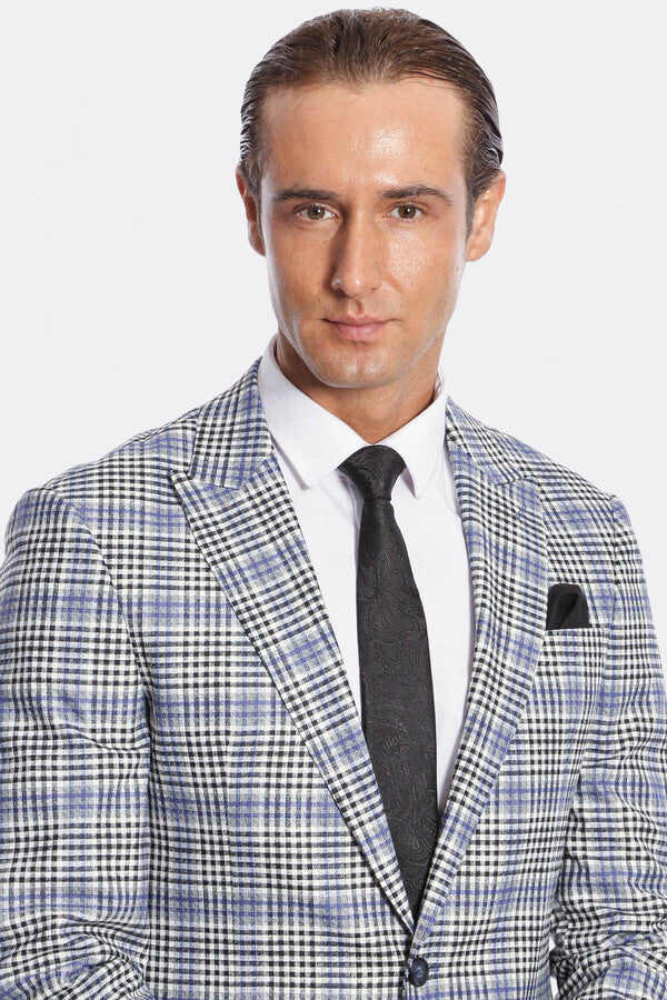 Ekose Desenli Slim Fit Siyah Mavi Erkek Ceket - Wessi