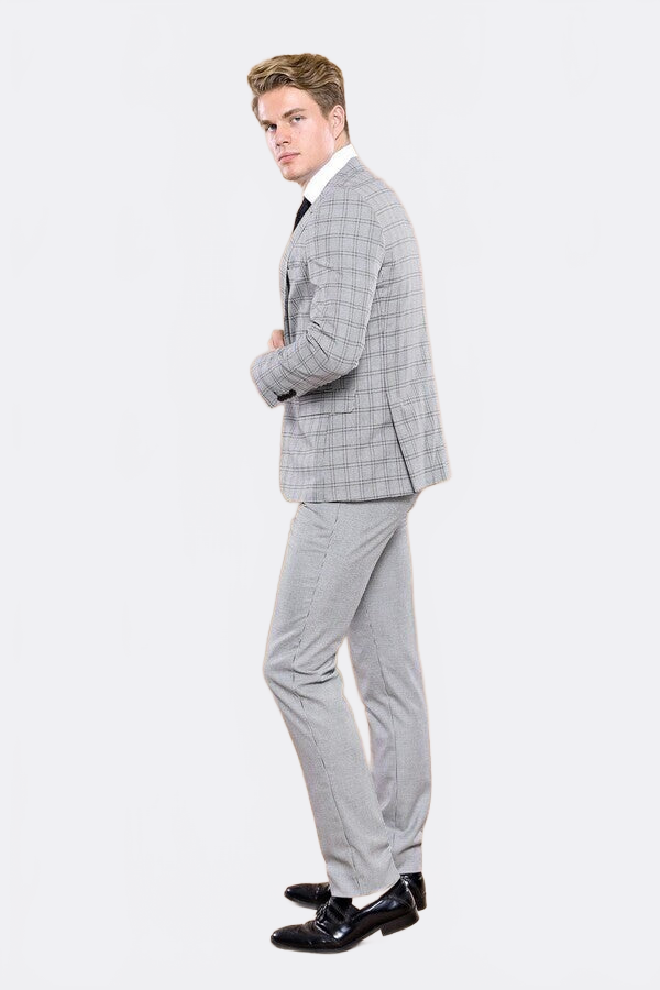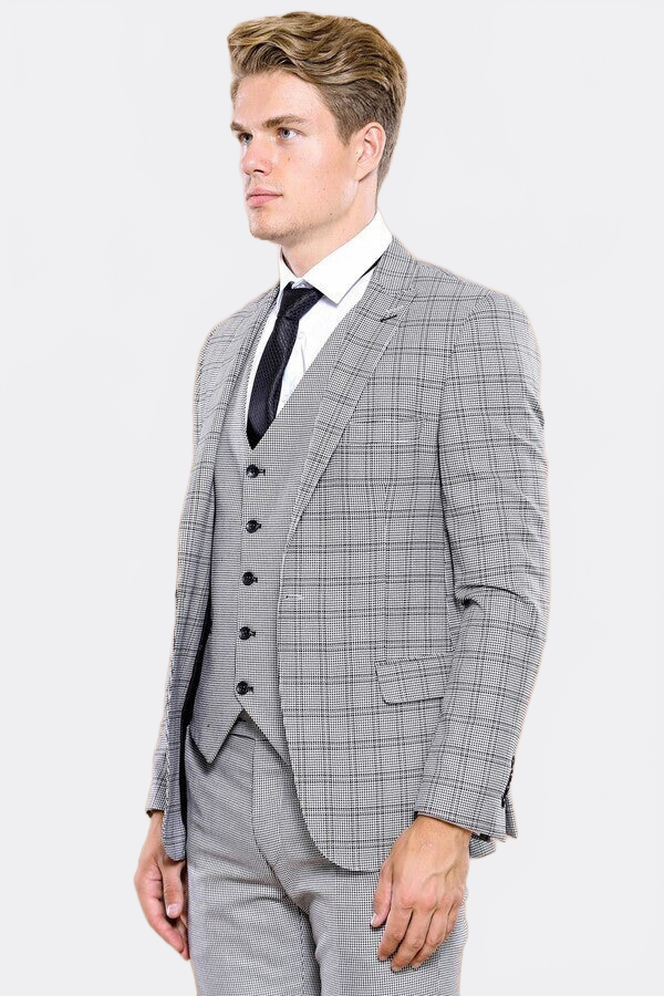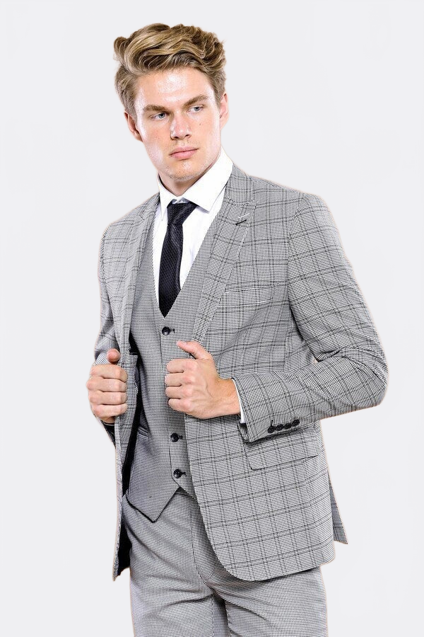 Gri ekose takım elbise ile iş hayatında zarif ve modern görünün. Ekose desenli ceket, pantolon ve yelek ile şık bir kombinasyon.