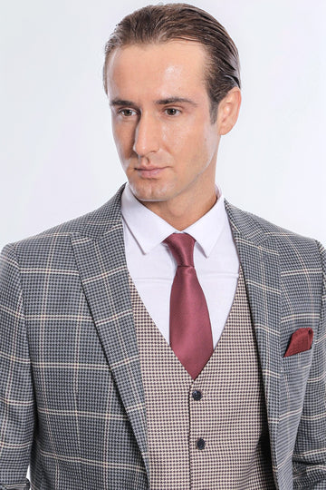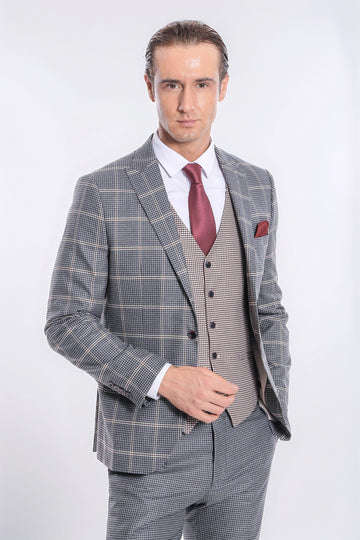 Füme Ekoseli Desenli Yelekli Takım Elbise - Wessi