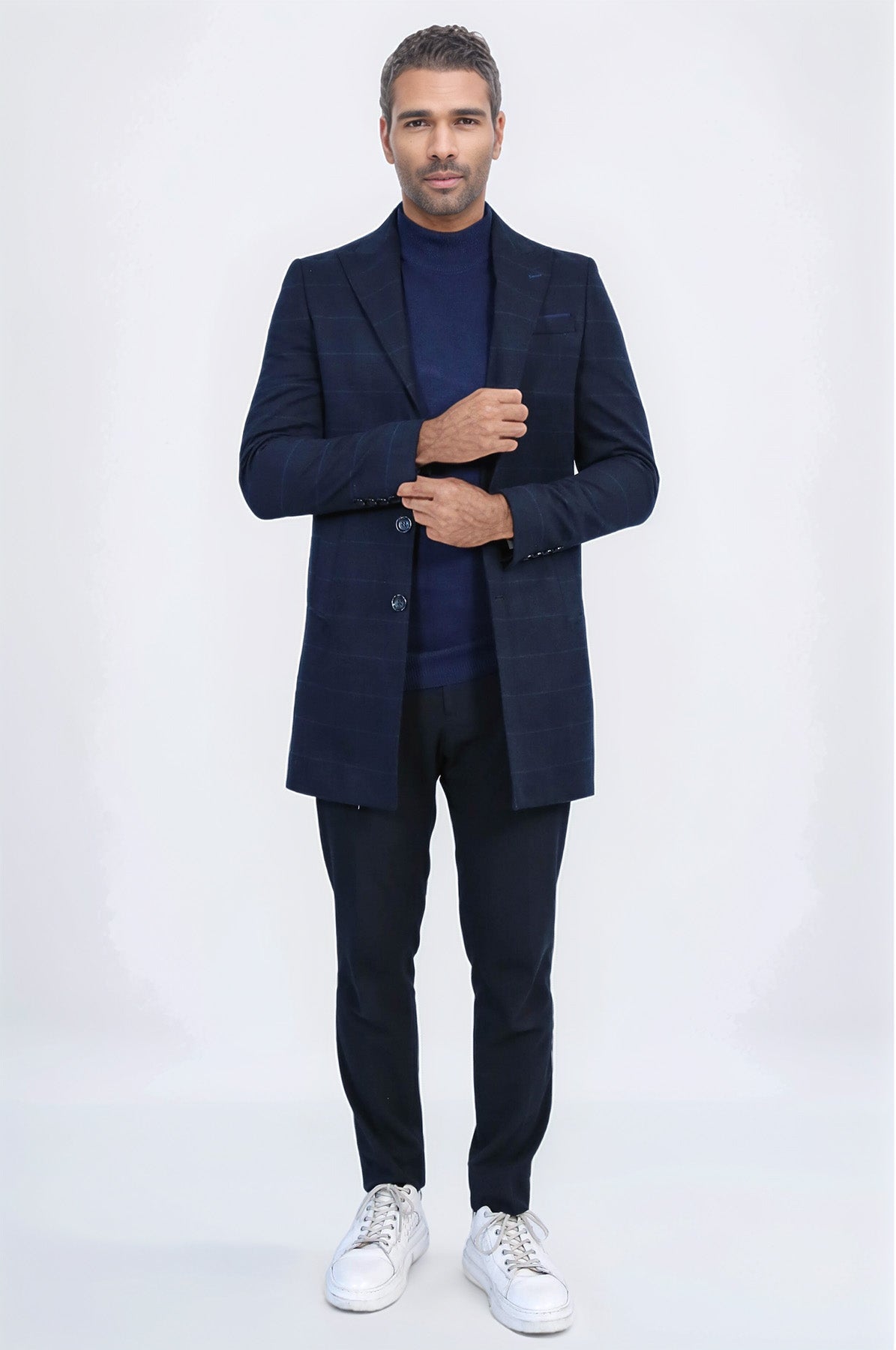 Sivri ve geniş yakadan oluşan erkek dış giyim modelidir. Koyu lacivert renge sahip bu model, slim fit kesime sahiptir ve kaşe kumaştan üretilmiştir. Ürünün ön kısmında kumaş ile aynı renge sahip 3 düğme bulunmaktadır. Kol yanlarında da aynı model düğmelere yer verilmiştir. Kumaş, açık lacivert tonlardan oluşan ekose çizgili desene sahiptir. Model, özellikle balıkçı yaka kazak ve gömlek gibi diğer ürünler ile beraber rahatlıkla kullanılabilmektedir.