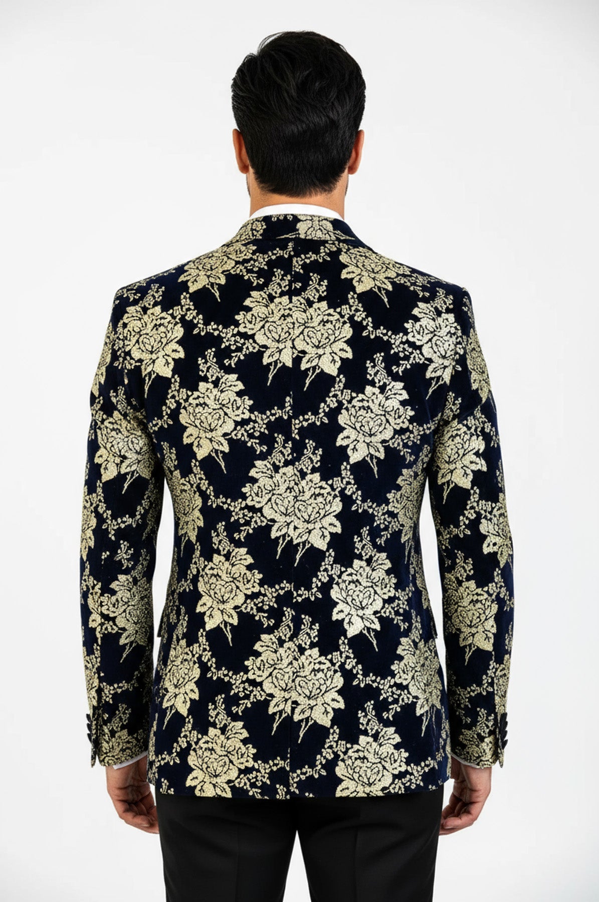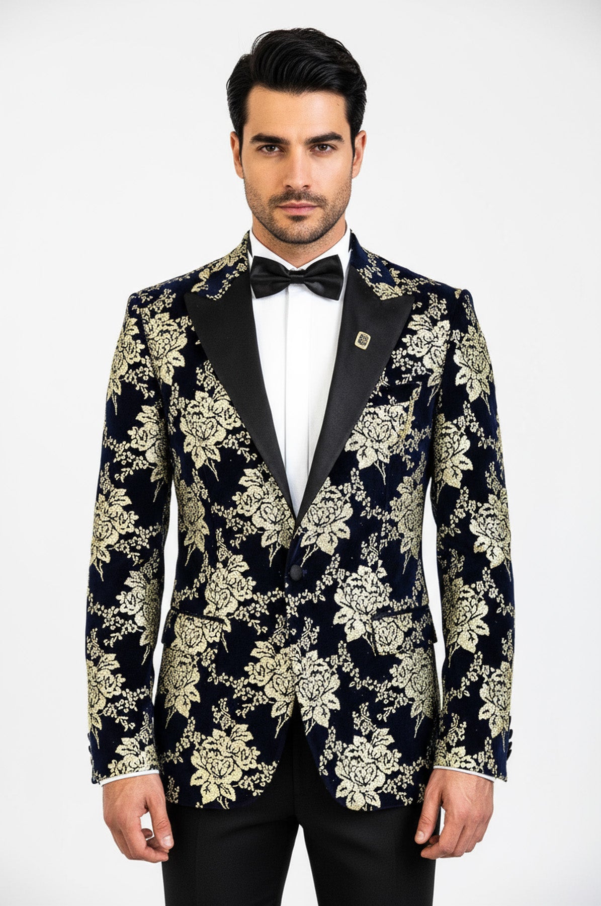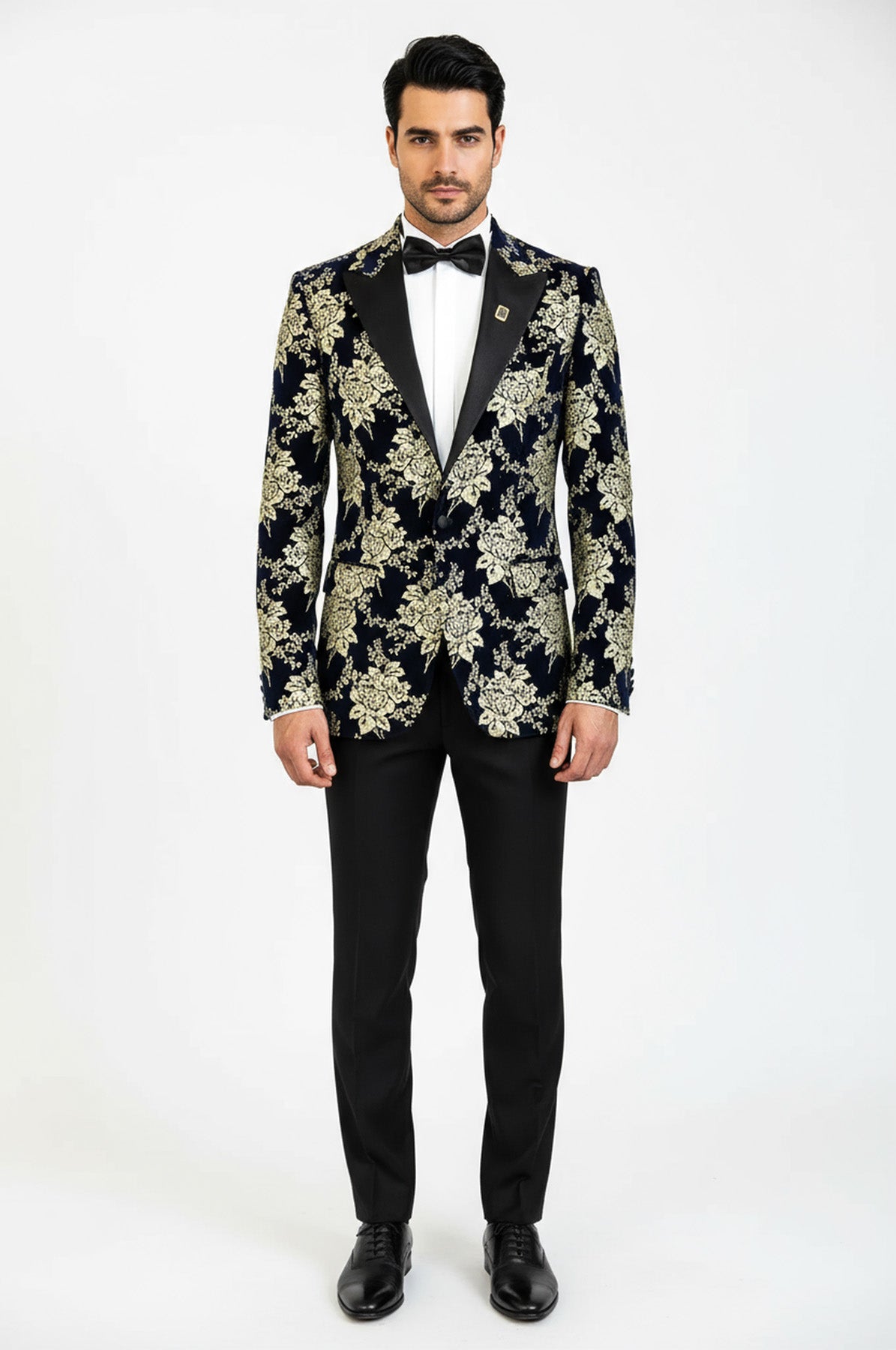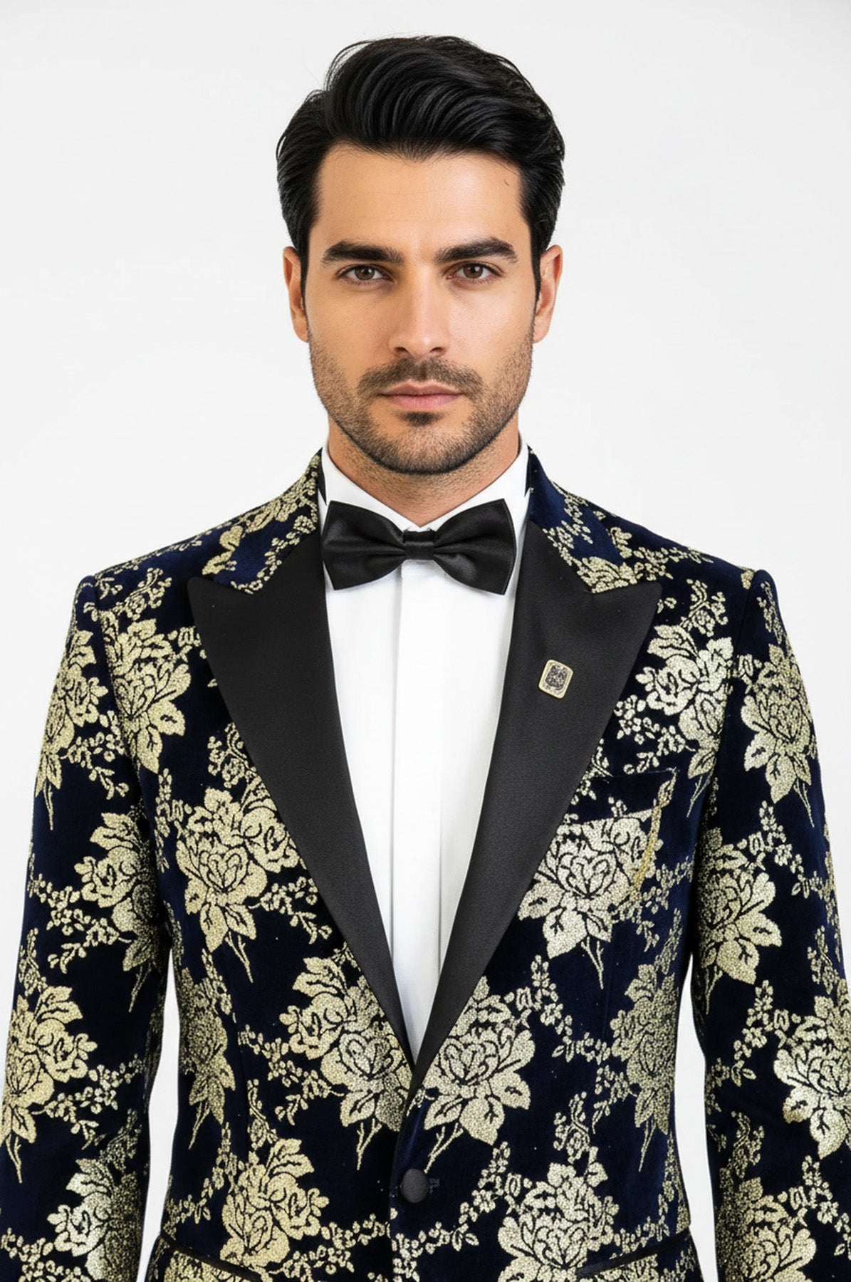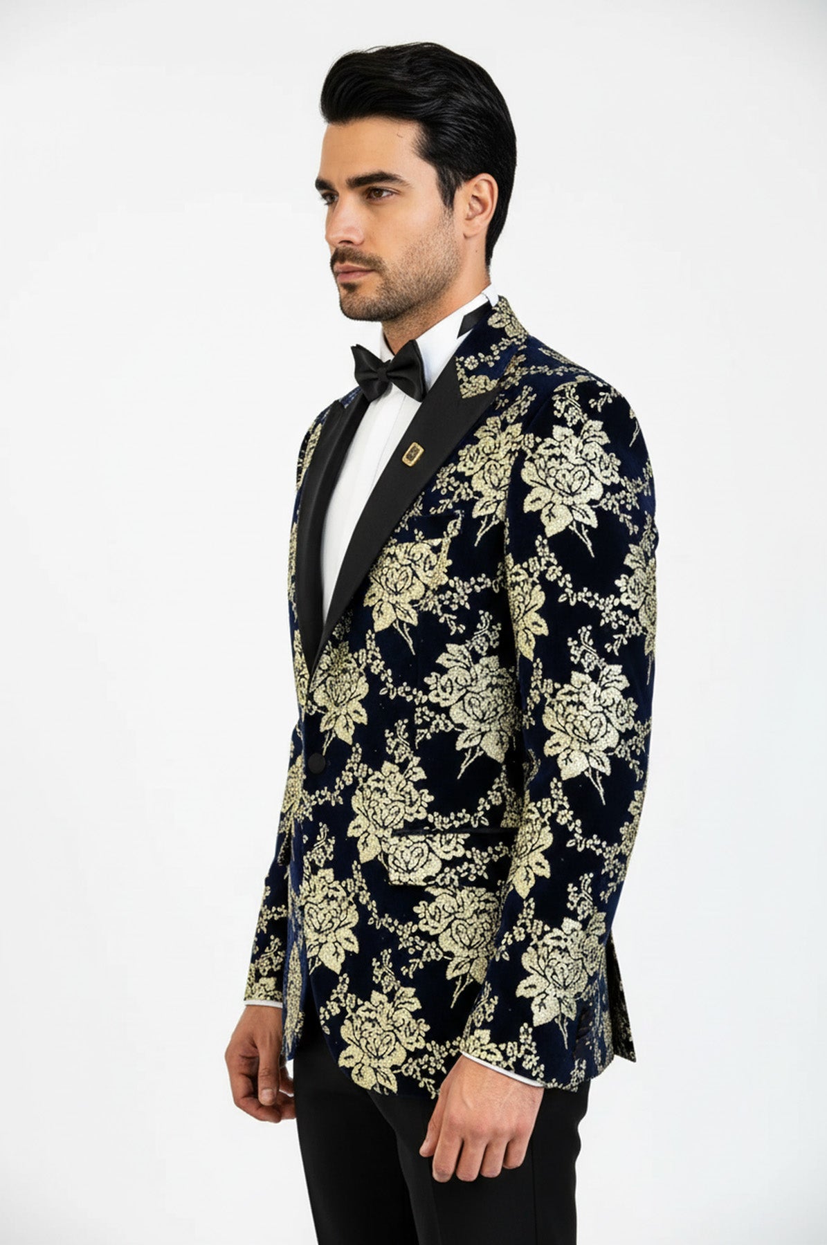 Gold Çiçek Desenli Lacivert Erkek Smokin Ceket - Wessi