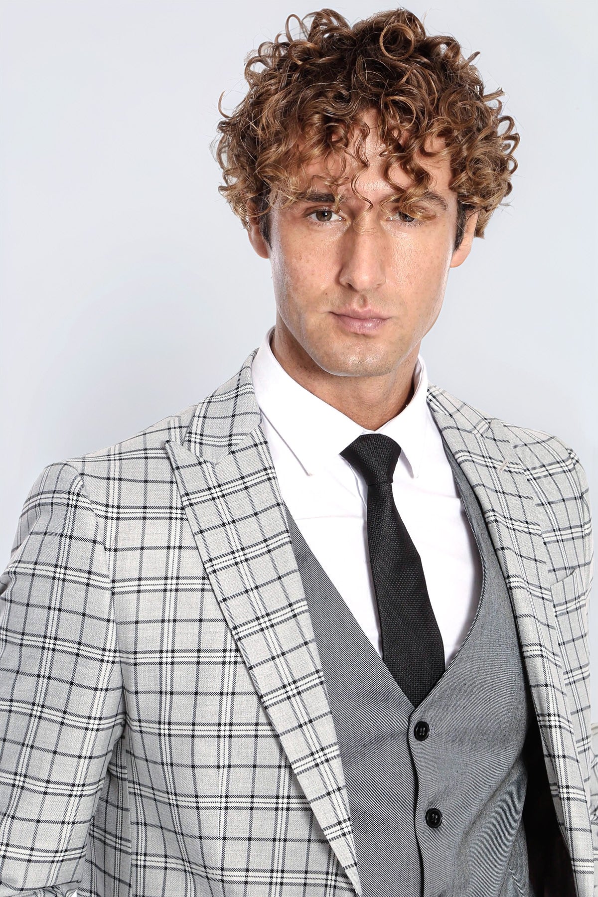 Gri Yelekli Slim Fit Ekose Açık Gri Erkek Takım Elbise - Wessi