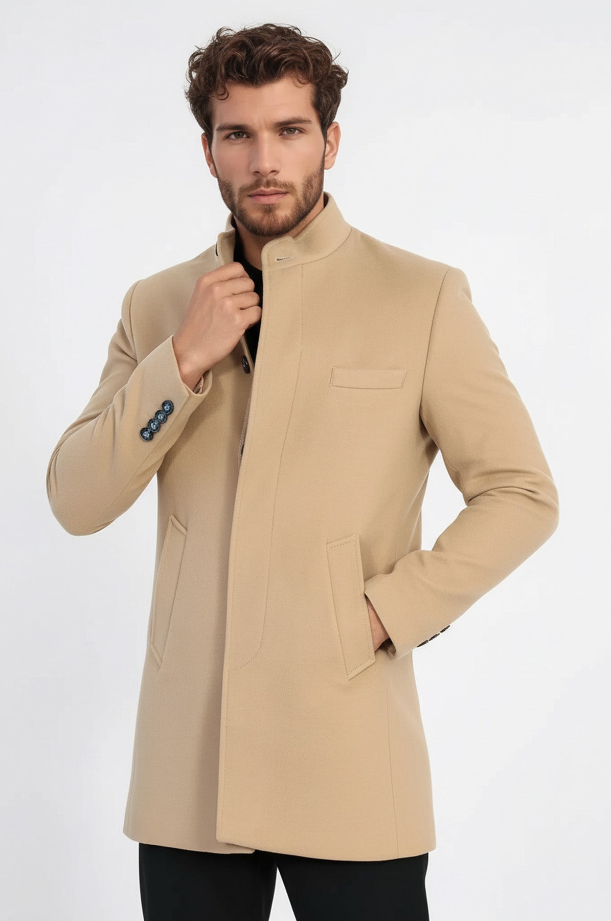 Kaşe kumaştan üretilmiş hakim yaka, uzun kaban ve gizli düğme modelli bej renk erkek kaban ürünüdür.