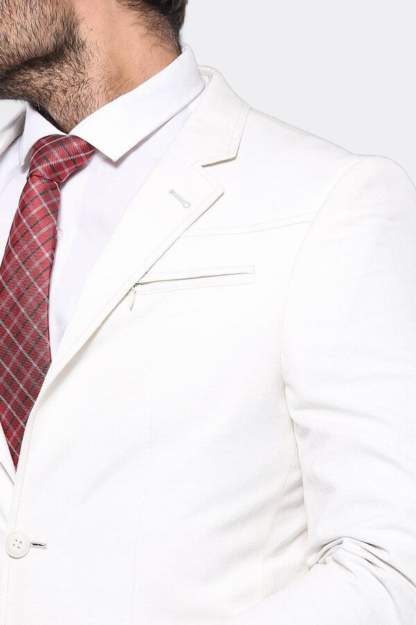 Yazlık keten krem renkli kumaş ile tasarlanmış, mono yaka, çift yırtmaçlı, desensiz, ekosesiz, çift düğmeli, slim fit keten ceket modelidir.