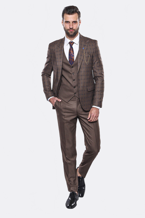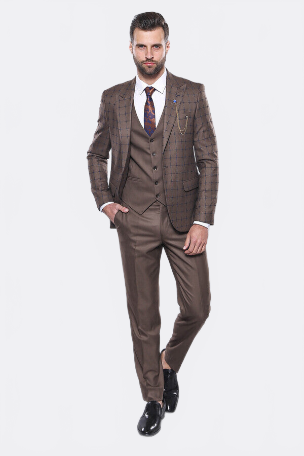 Kahverengi Ekose Yelekli Spor Takım Elbise - Wessi