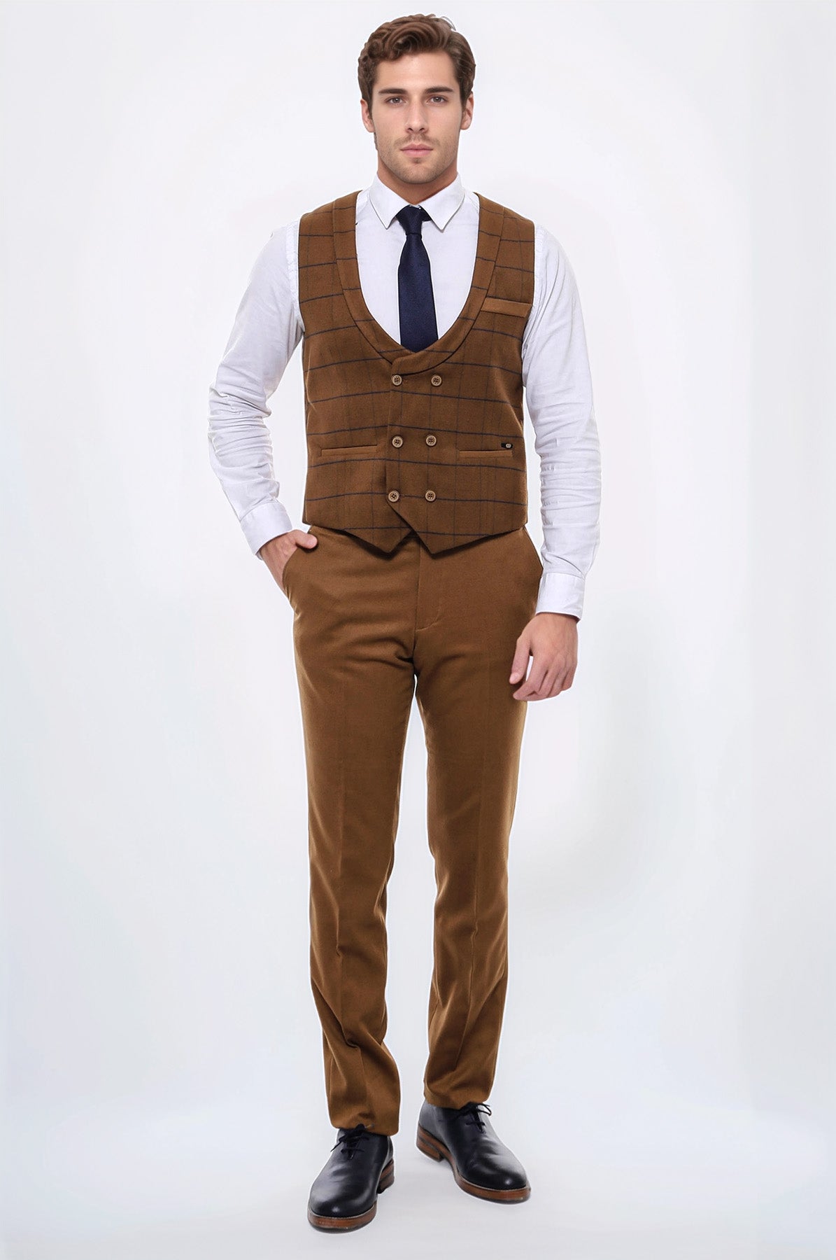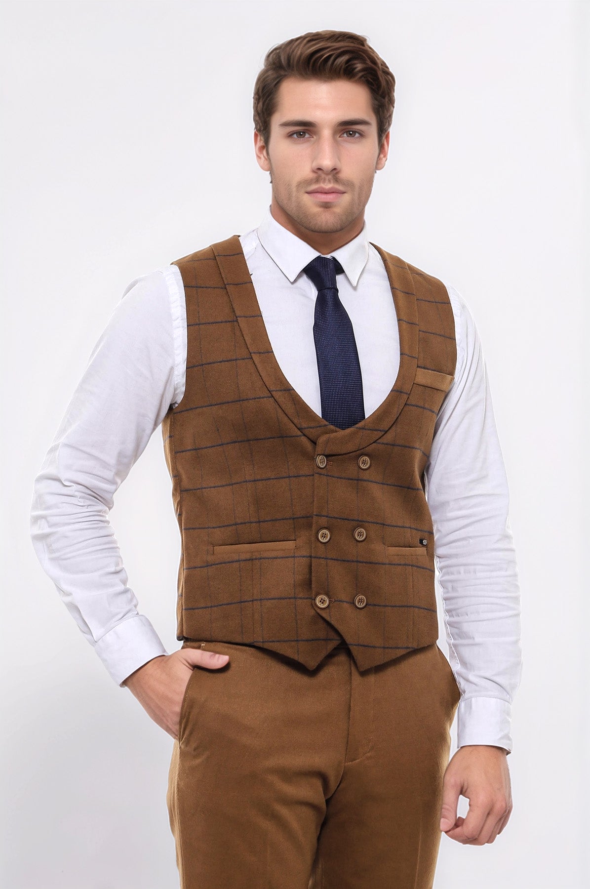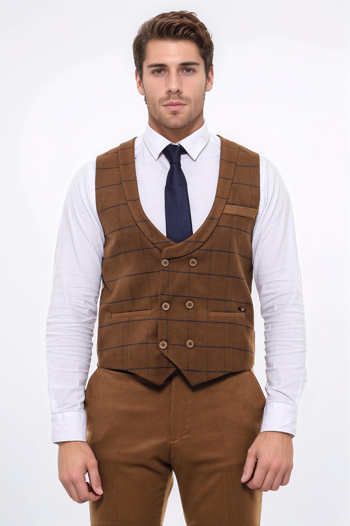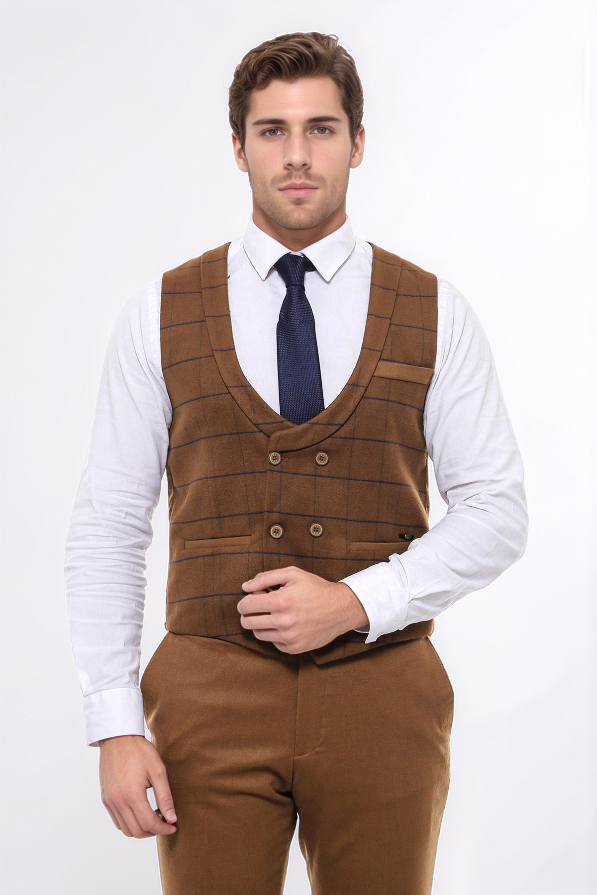 Kareli Desenli Kruvaze Kahverengi Erkek Yelek - Wessi