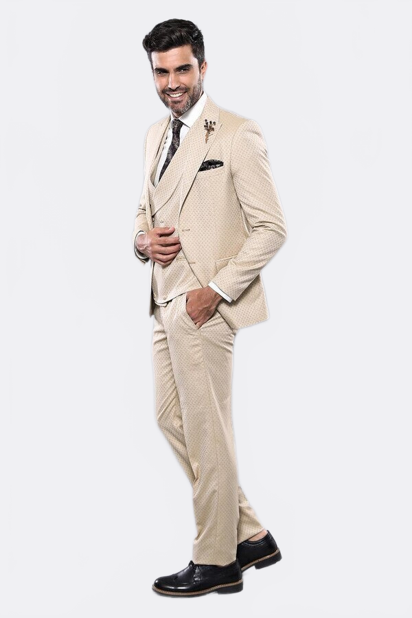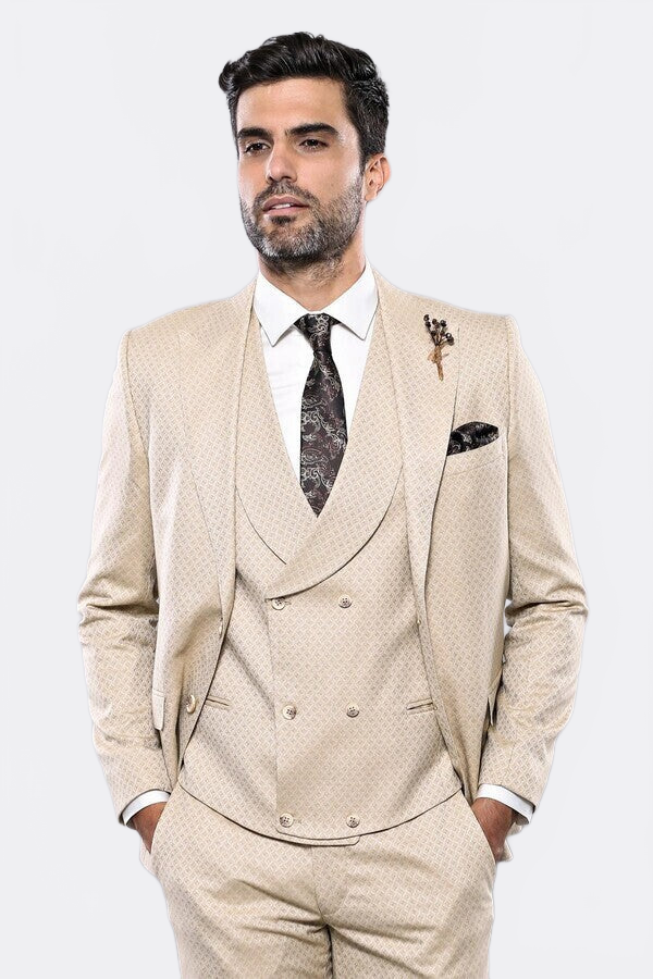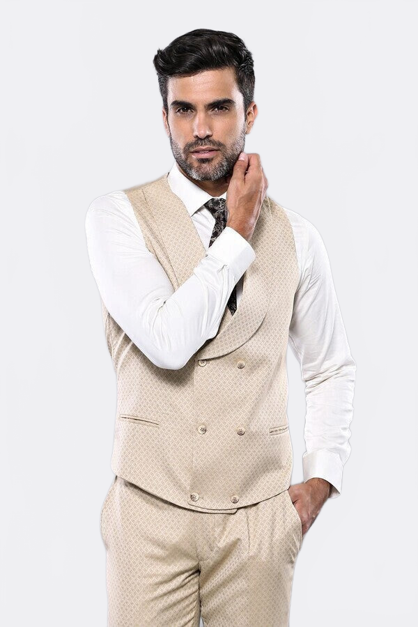 Kendinden Desenli Bej Yelekli Takım Elbise | Wessi