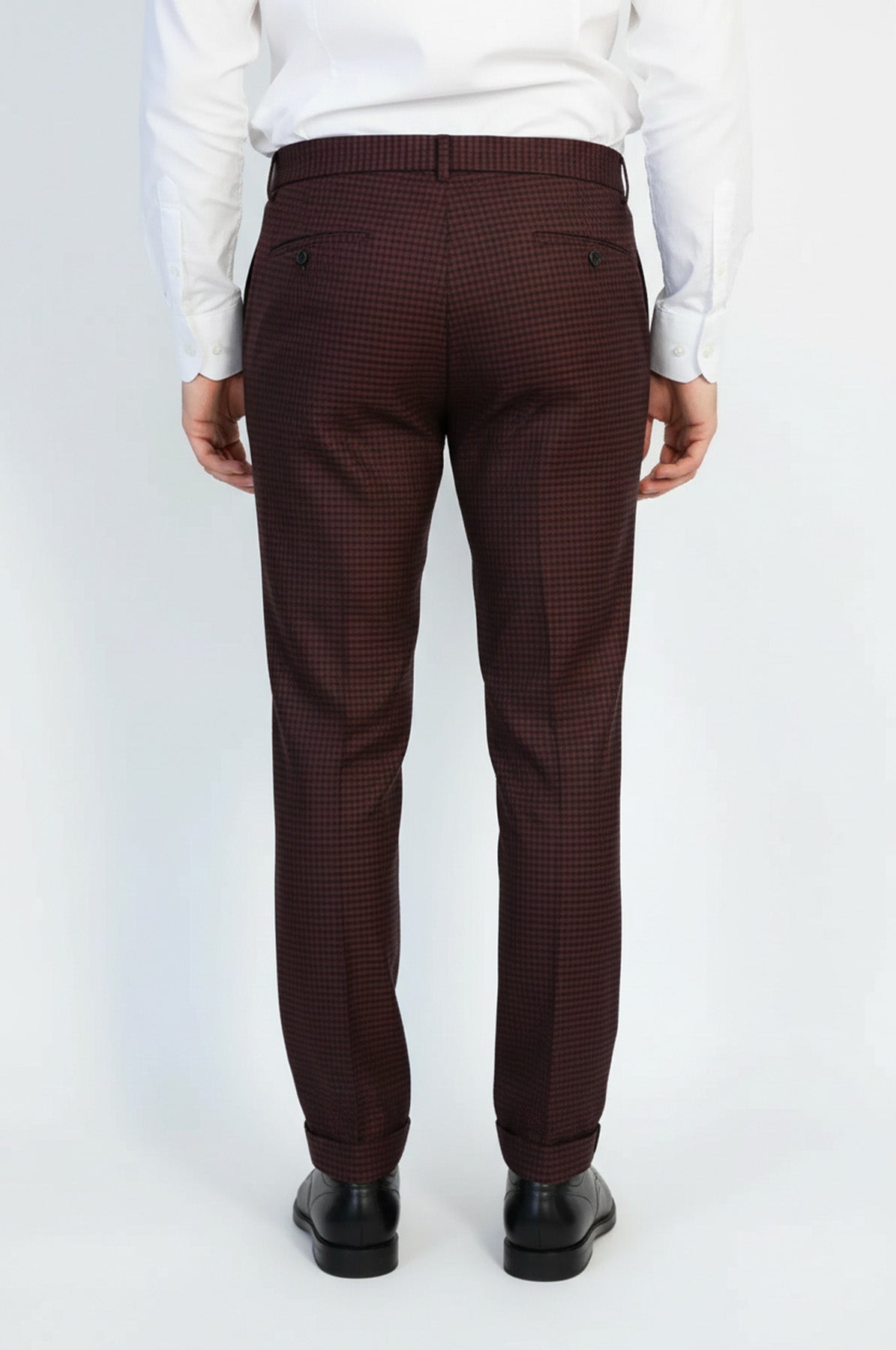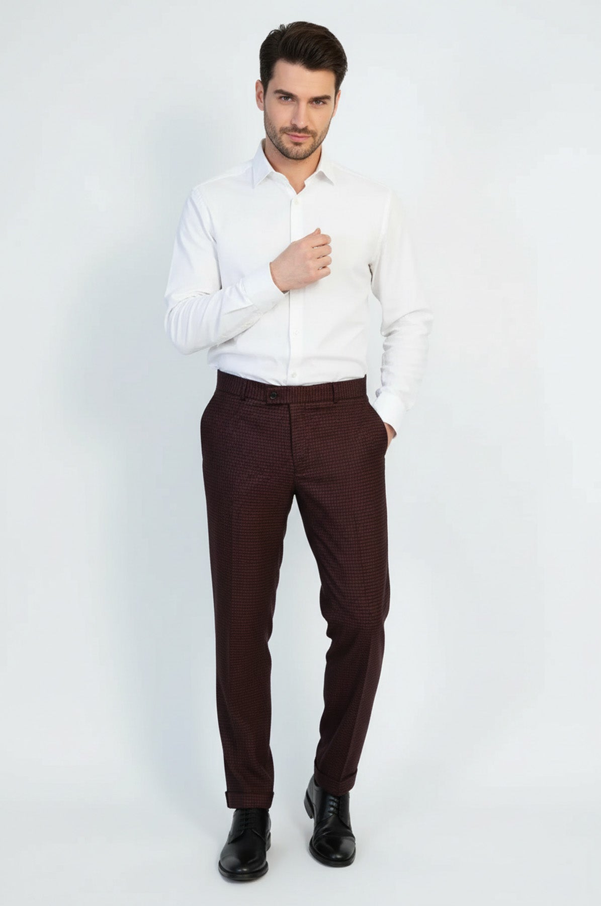 Koyu bordo mikro desenli kumaş pantolon ile iş toplantılarından günlük şık kombinlere kadar her ortamda rahat ve modern görünün. Mikro desen detayı ve slim fit kesimiyle sofistike bir pantolon.