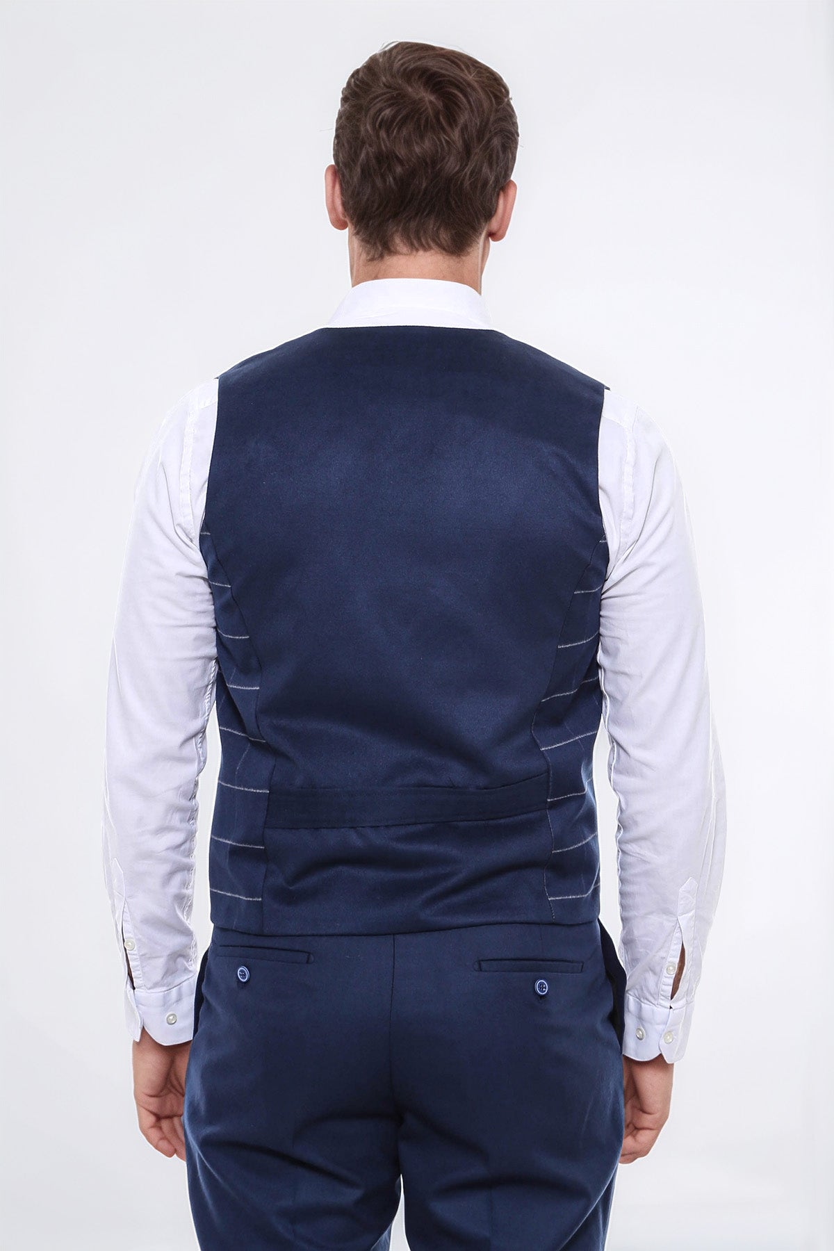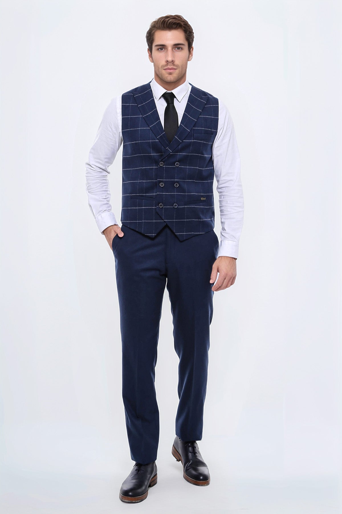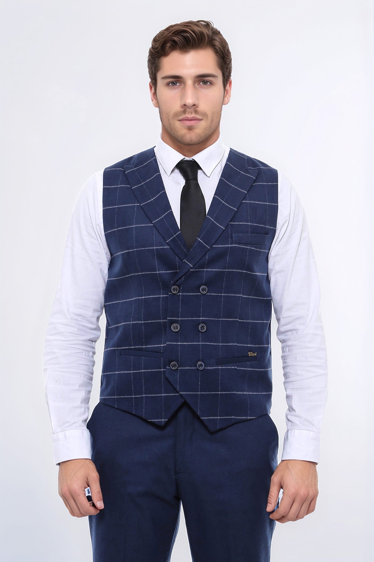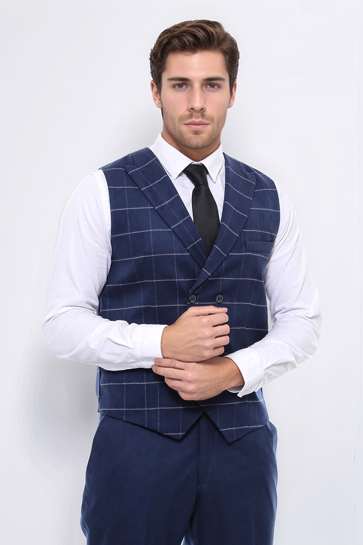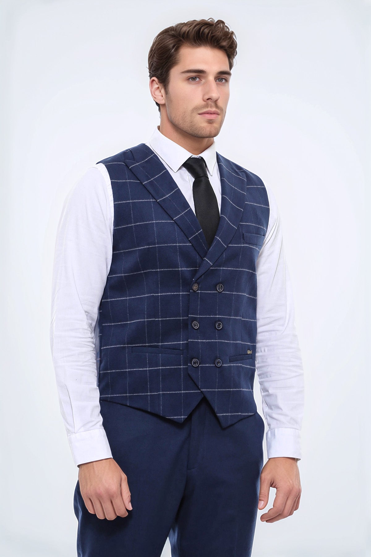 Kruvaze Yakalı Kareli Desenli Mavi Erkek Yelek - Wessi