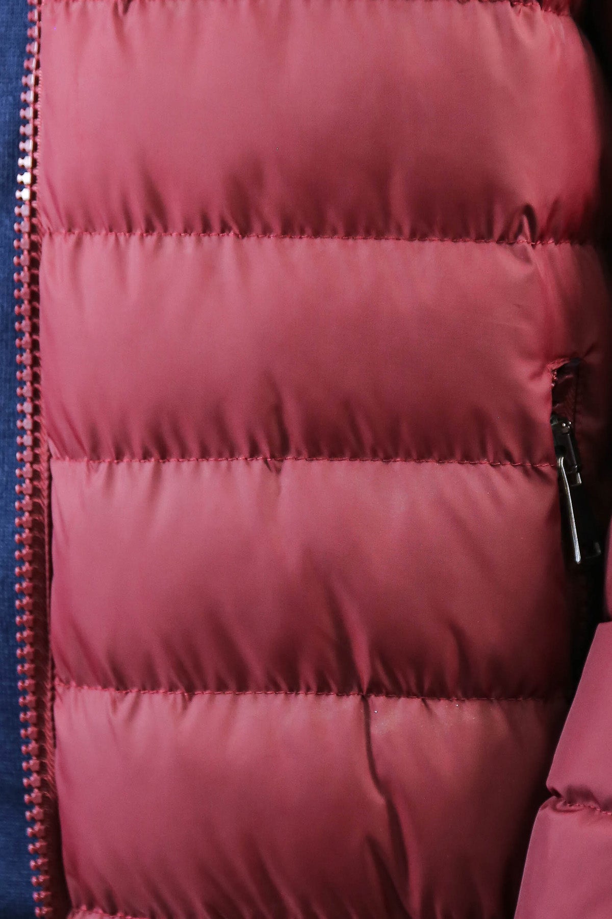 Kapitone bordo renk polyester kumaşta ile tasarlanmış, kürklü kapüşon modelli slim fit şişme mont.