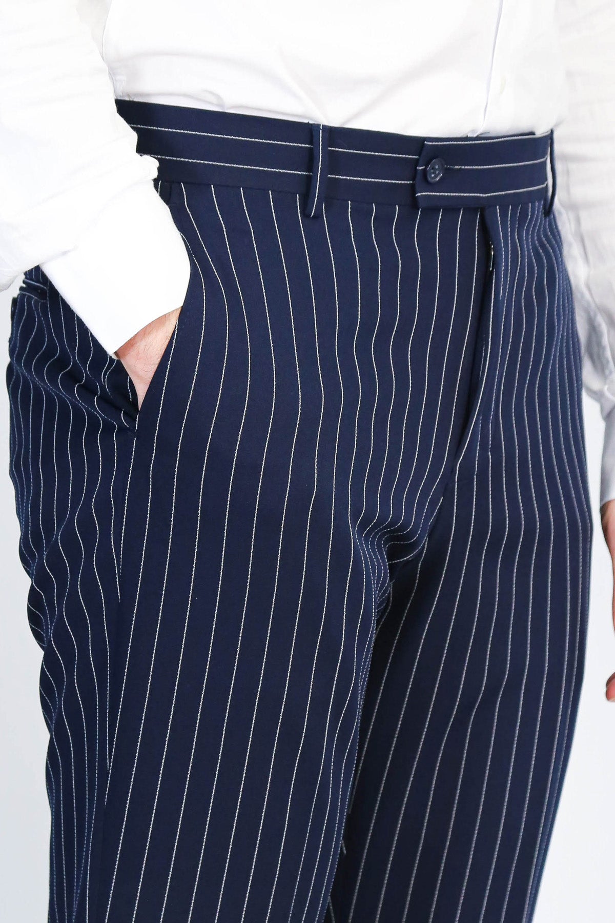 Beyaz Çizgili Desen: Sade lacivert pantolonlardan farklı, dinamik ve modern görünüm.