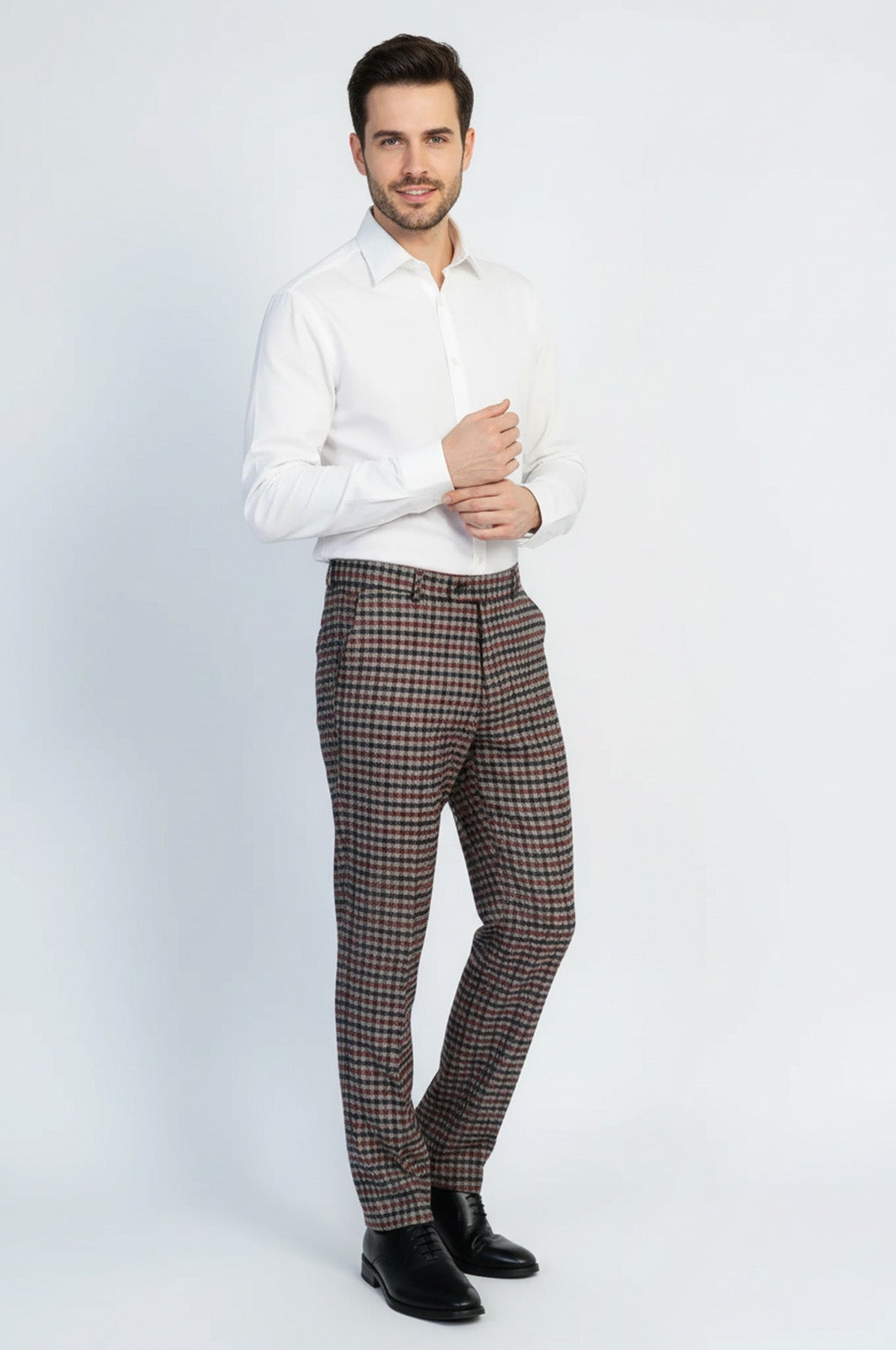 Lacivert bordo kareli kumaş pantolon ile iş toplantılarından günlük şık kombinlere kadar her ortamda rahat ve modern görünün. Kare desen ve bordo detay ile sofistike bir pantolon.
