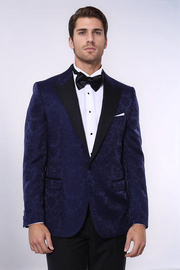 Desenli kumaş ile tasarlanmış slim-fit, tek düğmeli sivri yakalı lacivert smokin ceket modelidir. Fiyata sadece ceket dahildir.