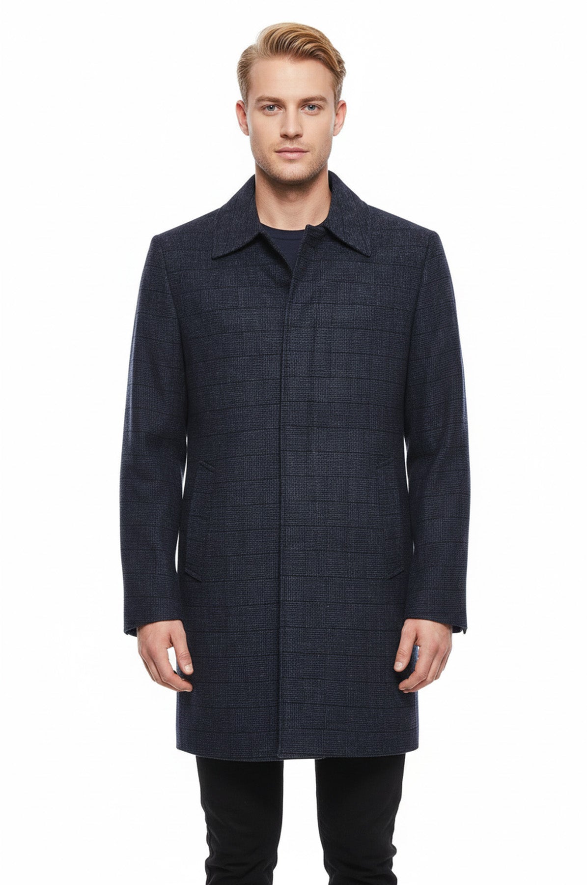 Lacivert Ekose Desenli Gizli Düğme Sivri Yaka Kaban - Wessi